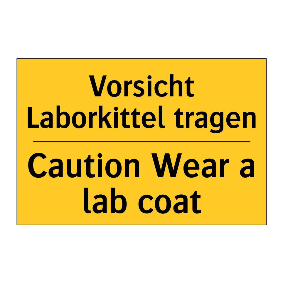 Zweisprachiges Warnschild mit deutschem Text Vorsicht Laborkittel tragen und englischem Text Caution Wear a lab coat