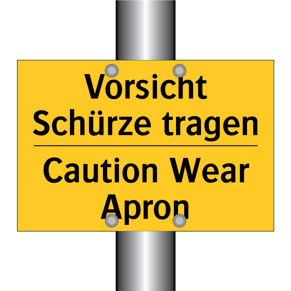 Zweisprachiges Warnschild mit deutschem Text Vorsicht Schürze tragen und englischem Text Caution Wear Apron