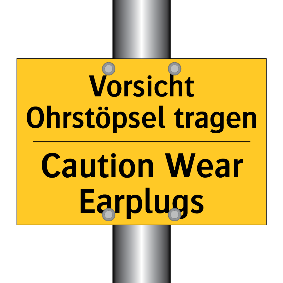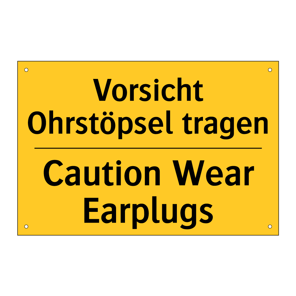 Zweisprachiges Warnschild mit deutschem Text Vorsicht Ohrstöpsel tragen und englischem Text Caution Wear Earplugs