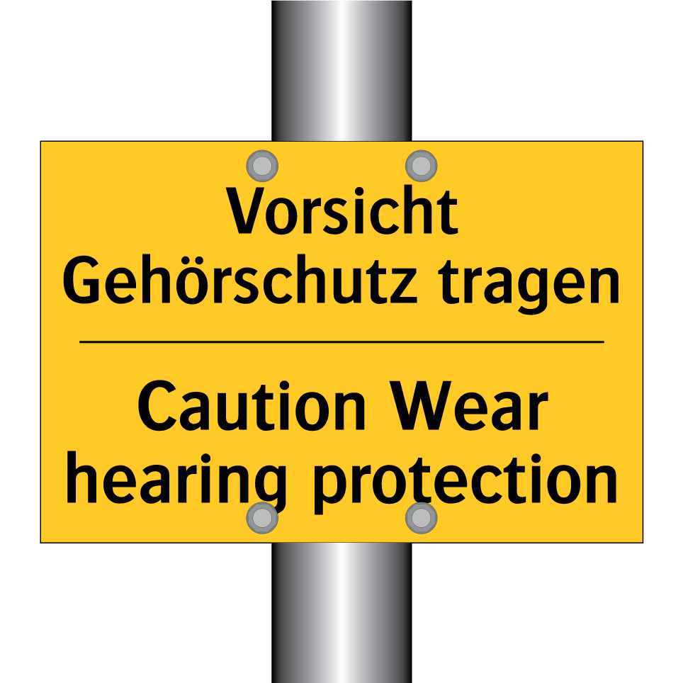 Zweisprachiges Warnschild mit deutschem Text Vorsicht Gehörschutz tragen und englischem Text Caution Wear hearing protection