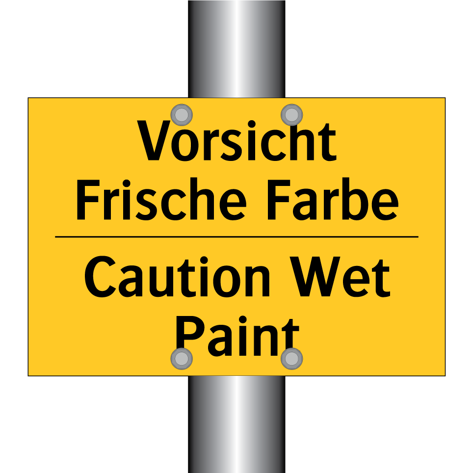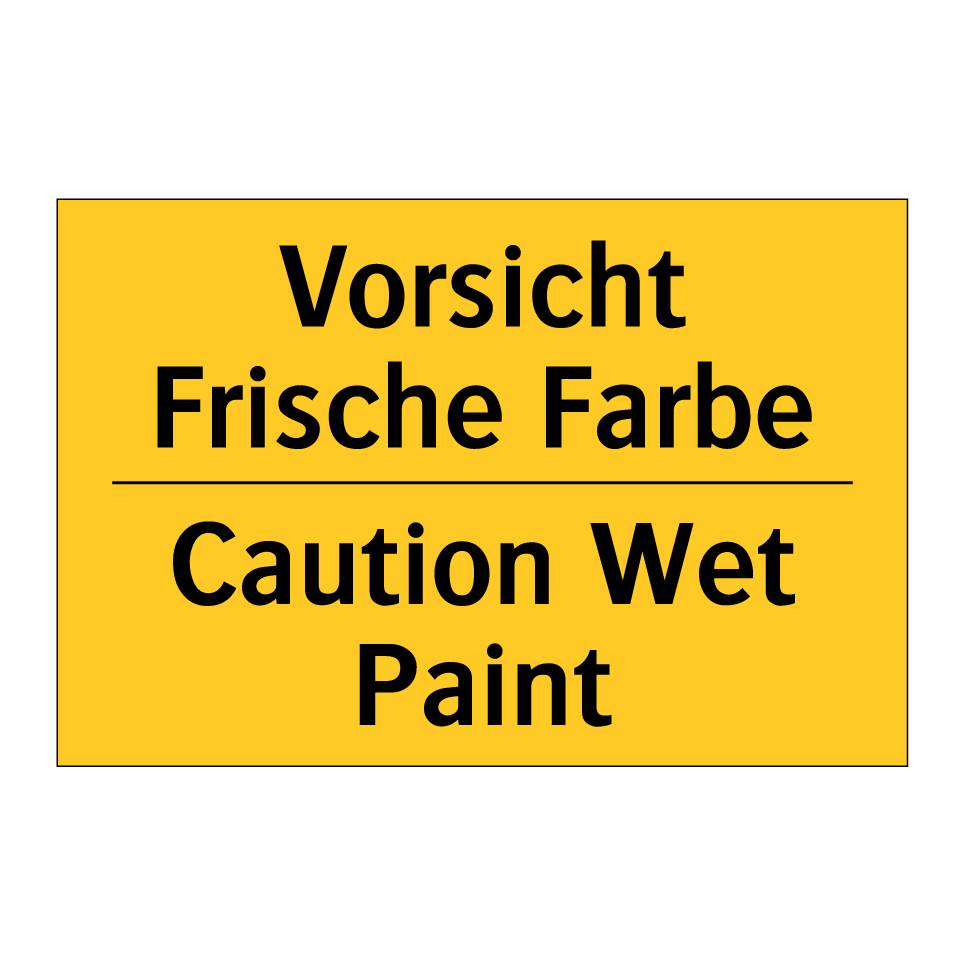Zweisprachiges Warnschild mit deutschem Text Vorsicht Frische Farbe und englischem Text Caution Wet Paint