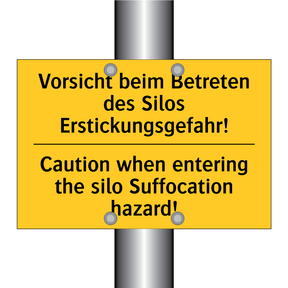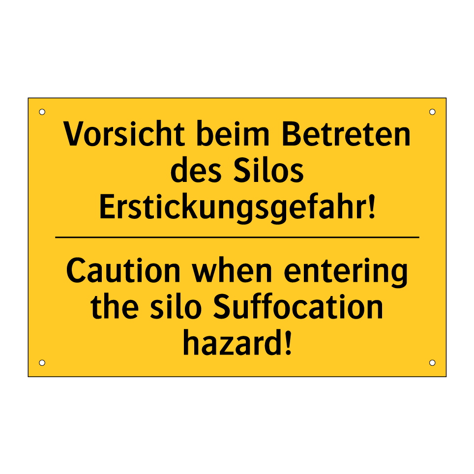 Zweisprachiges Warnschild mit deutschem Text Vorsicht beim Betreten des Silos Erstickungsgefahr! und englischem Text Caution when entering the silo Suffocation hazard!