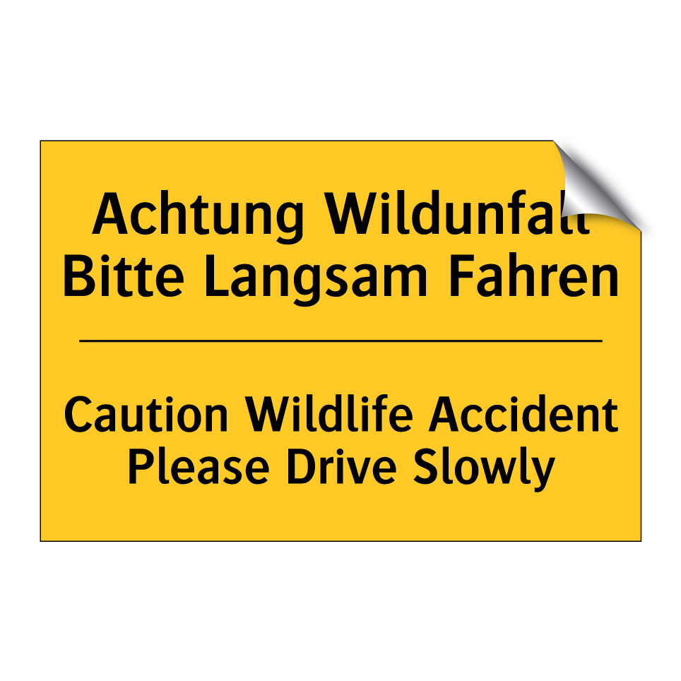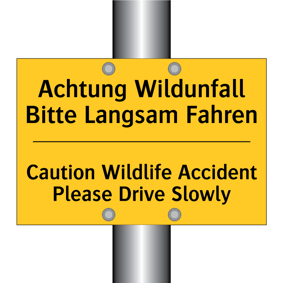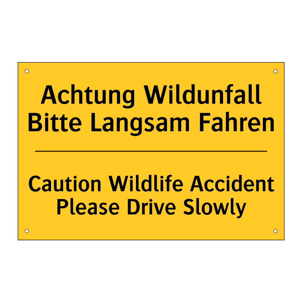 Zweisprachiges Warnschild mit deutschem Text Achtung Wildunfall Bitte Langsam Fahren und englischem Text Caution Wildlife Accident Please Drive Slowly