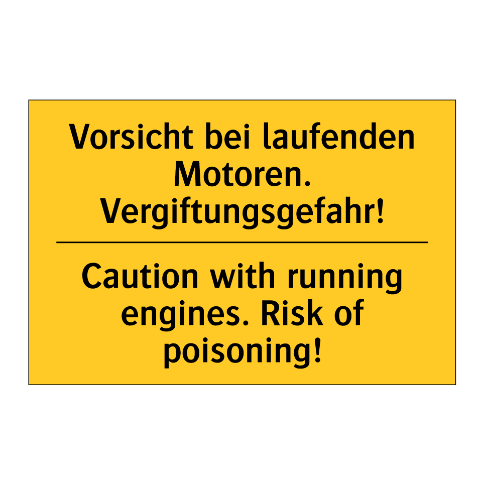 Zweisprachiges Warnschild mit deutschem Text Vorsicht bei laufenden Motoren. Vergiftungsgefahr! und englischem Text Caution with running engines. Risk of poisoning!