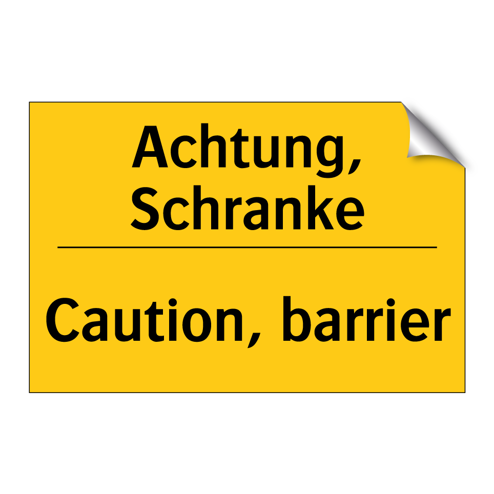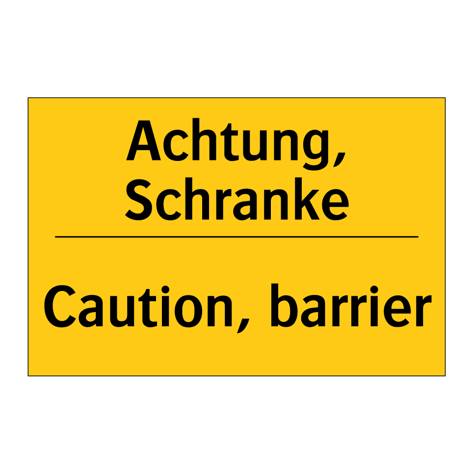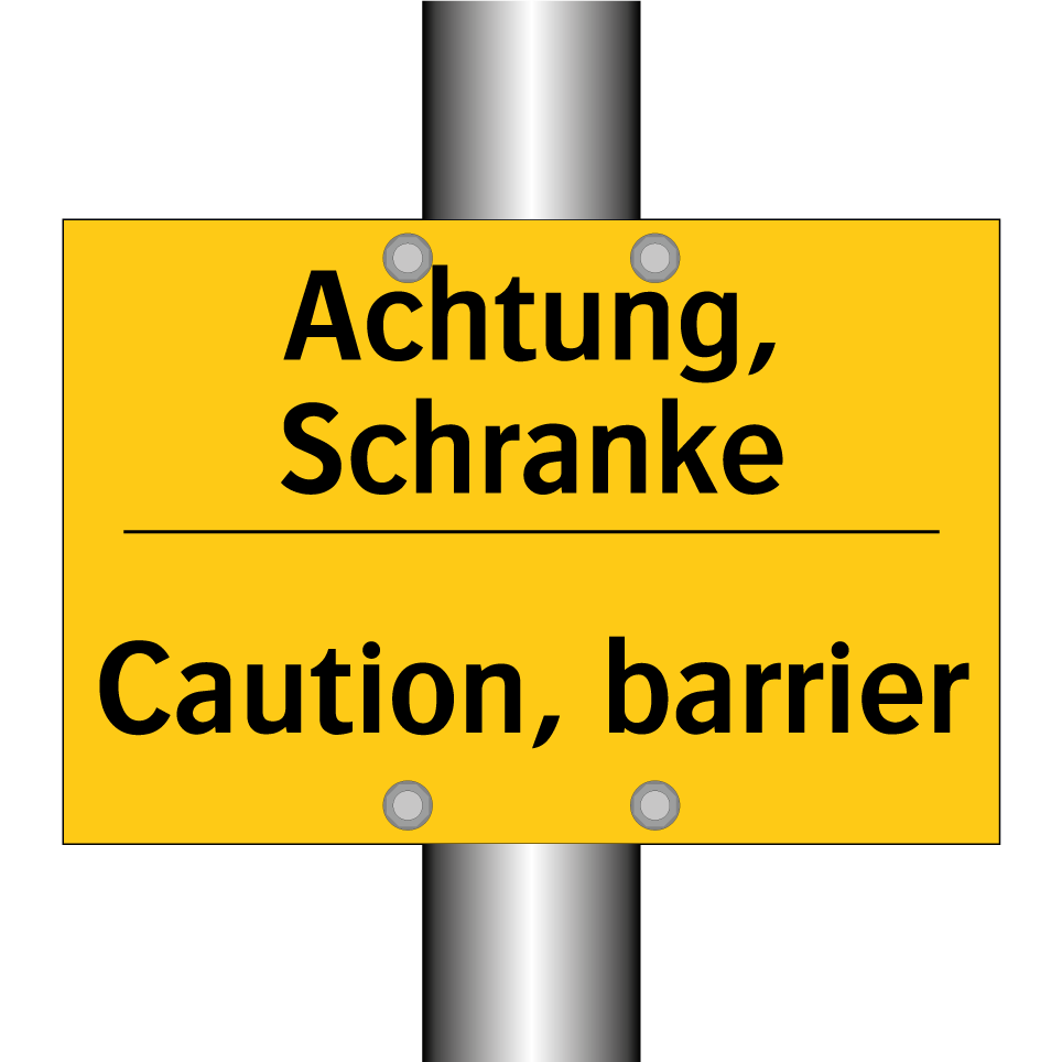 Zweisprachiges Warnschild mit deutschem Text Achtung, Schranke und englischem Text Caution, barrier