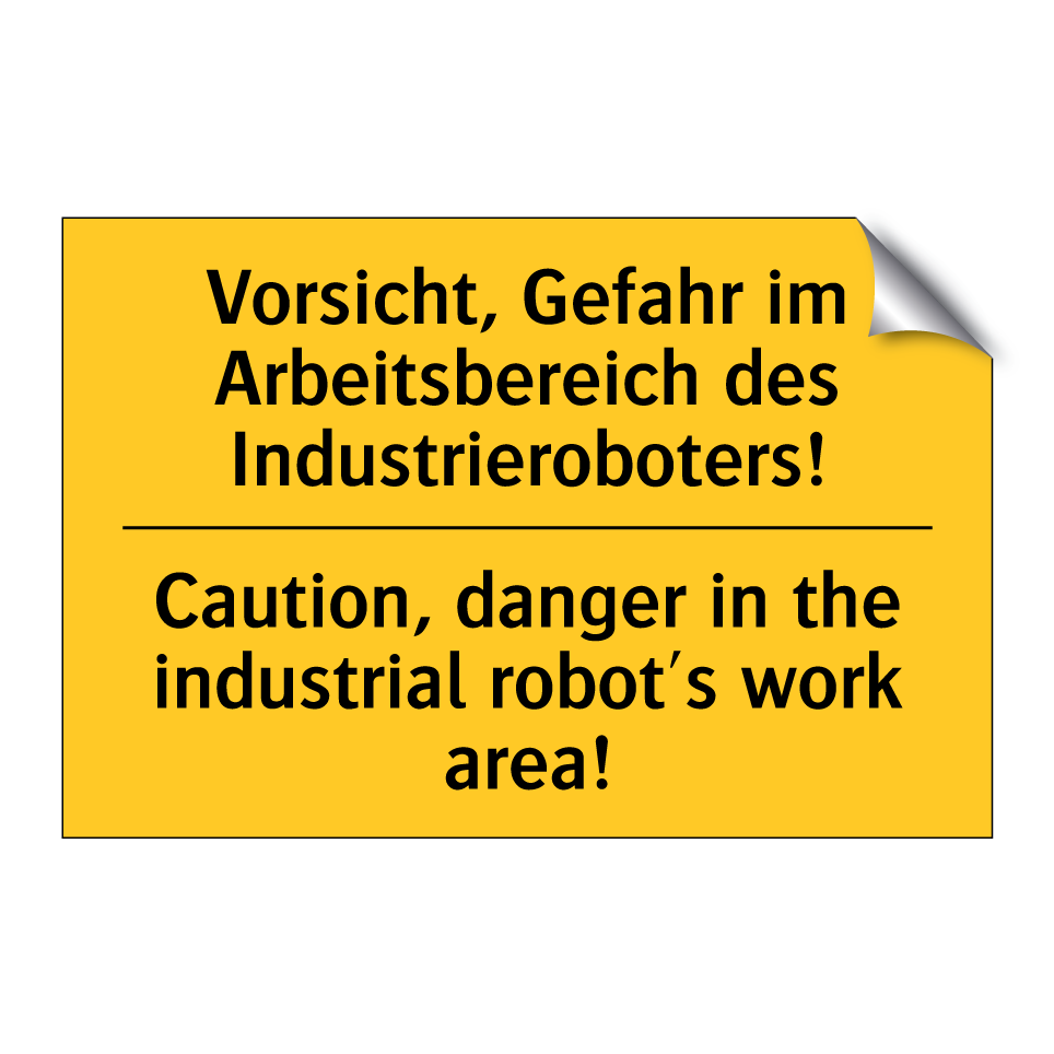 Zweisprachiges Warnschild mit deutschem Text Vorsicht, Gefahr im Arbeitsbereich des Industrieroboters! und englischem Text Caution, danger in the industrial robot's work area!