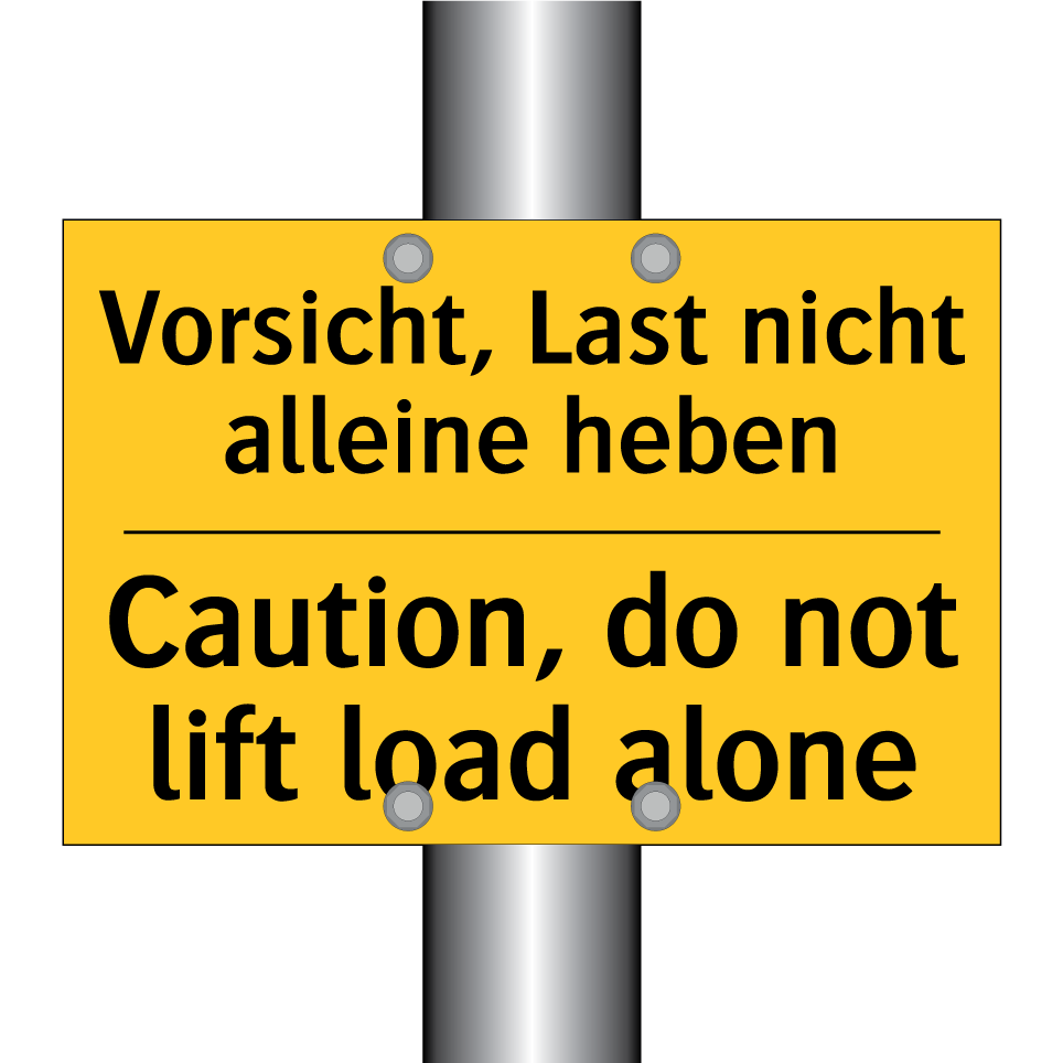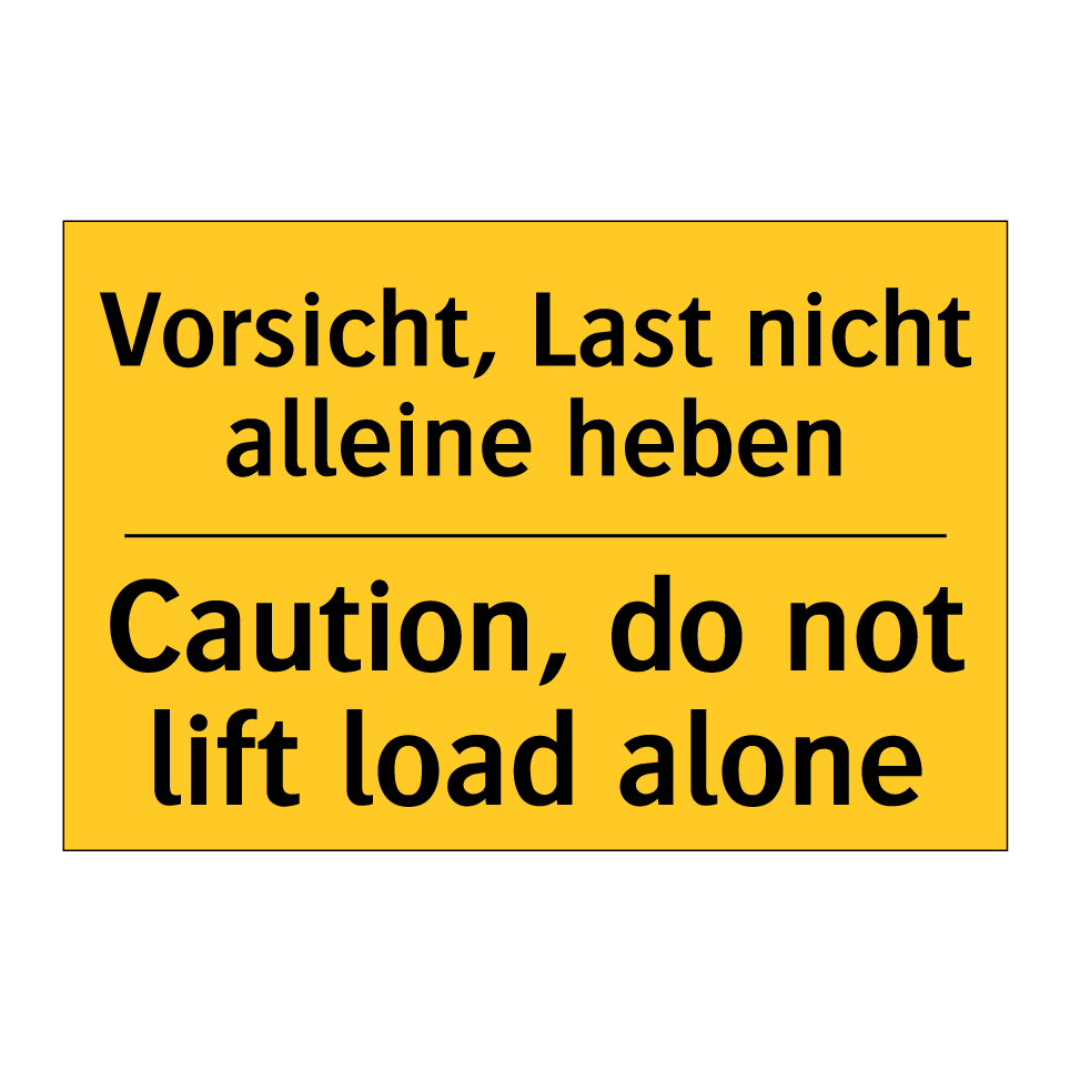 Zweisprachiges Warnschild mit deutschem Text Vorsicht, Last nicht alleine heben und englischem Text Caution, do not lift load alone