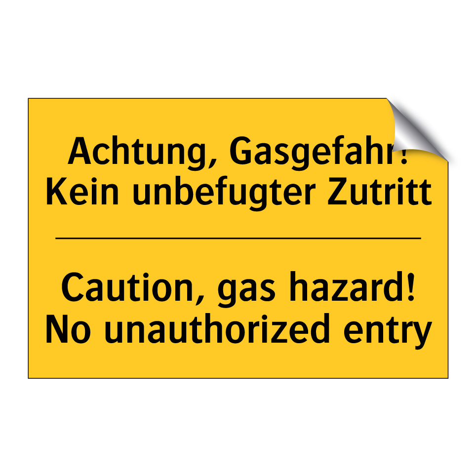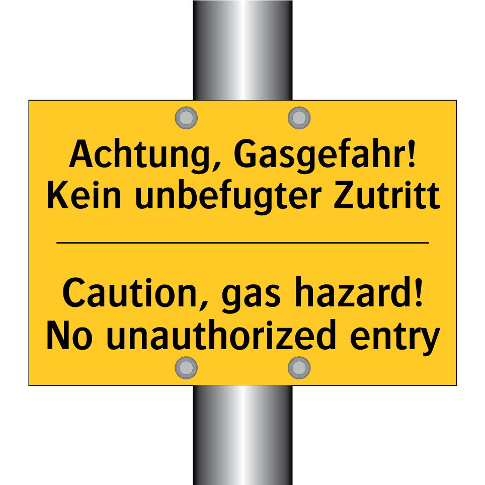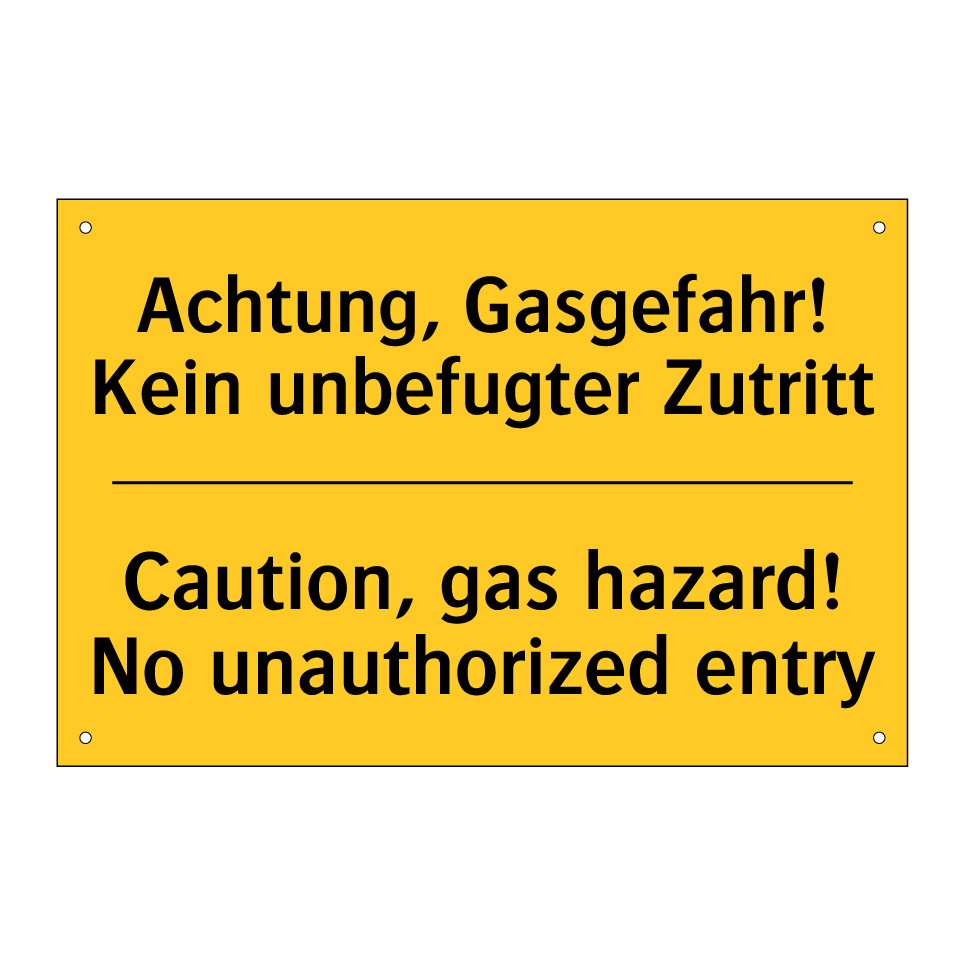 Zweisprachiges Warnschild mit deutschem Text Achtung, Gasgefahr! Kein unbefugter Zutritt und englischem Text Caution, gas hazard! No unauthorized entry
