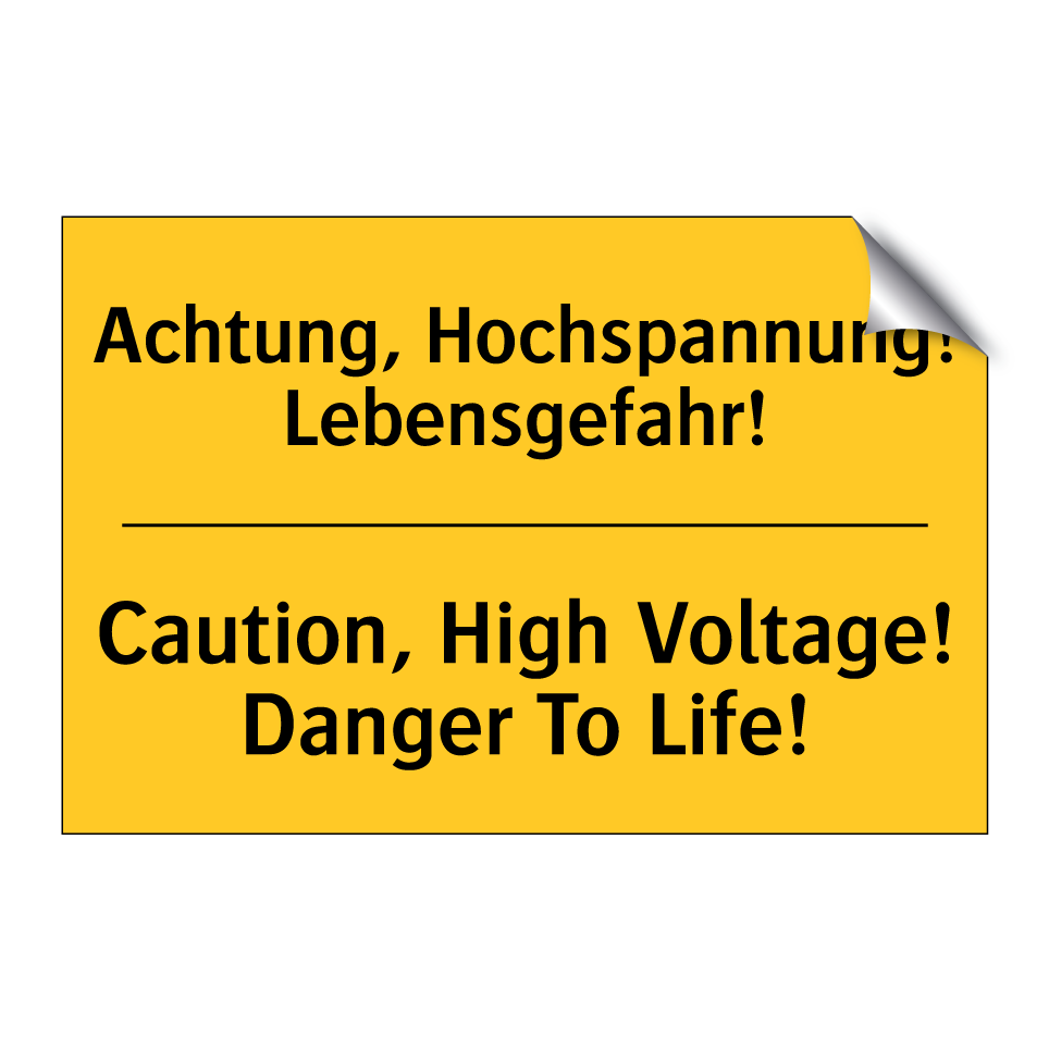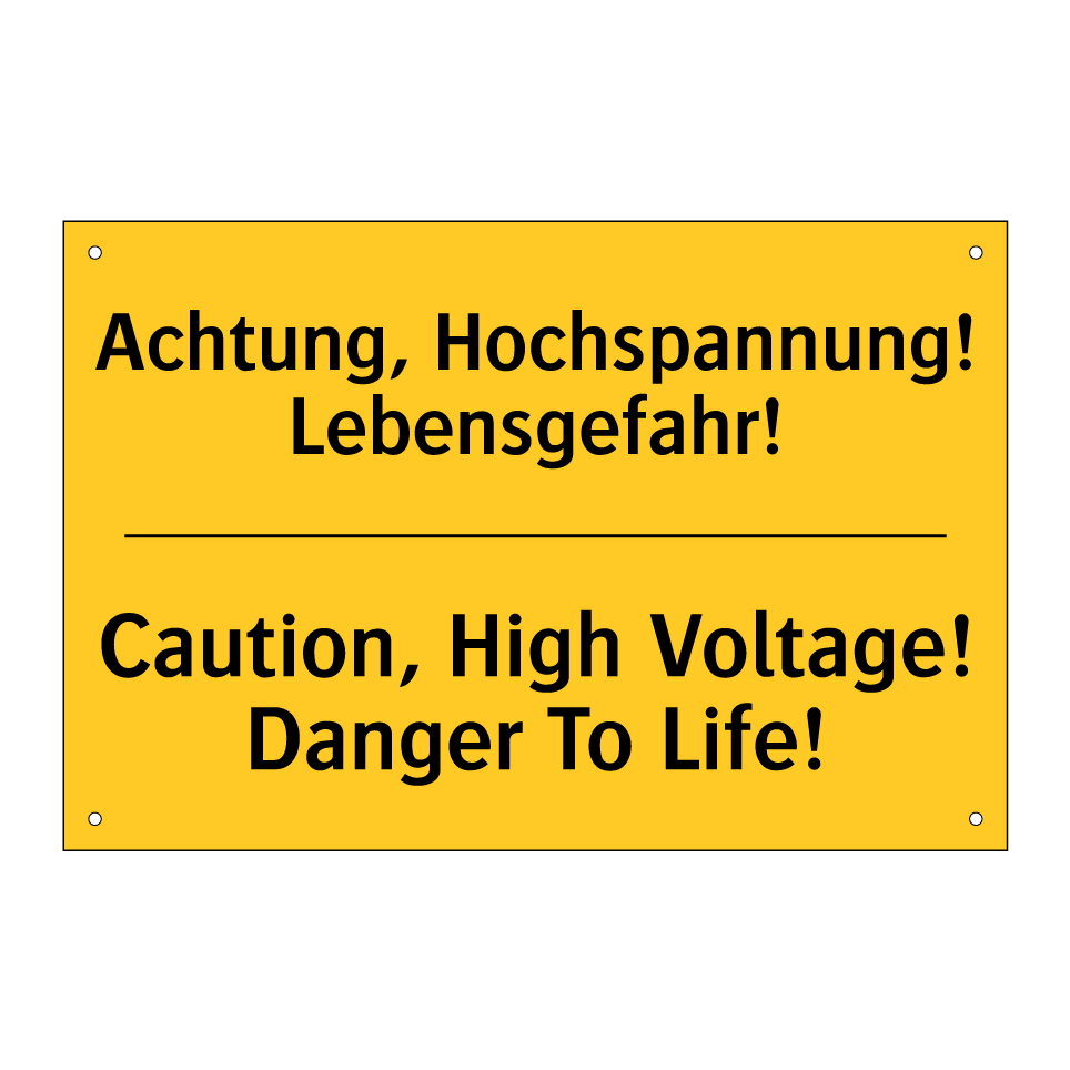 Zweisprachiges Warnschild mit deutschem Text Achtung, Hochspannung! Lebensgefahr! und englischem Text Caution, High Voltage! Danger To Life!