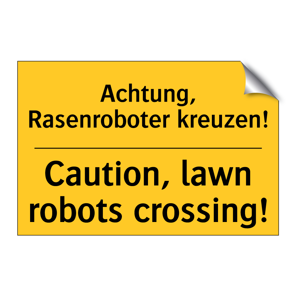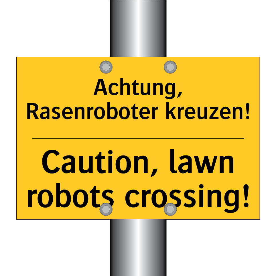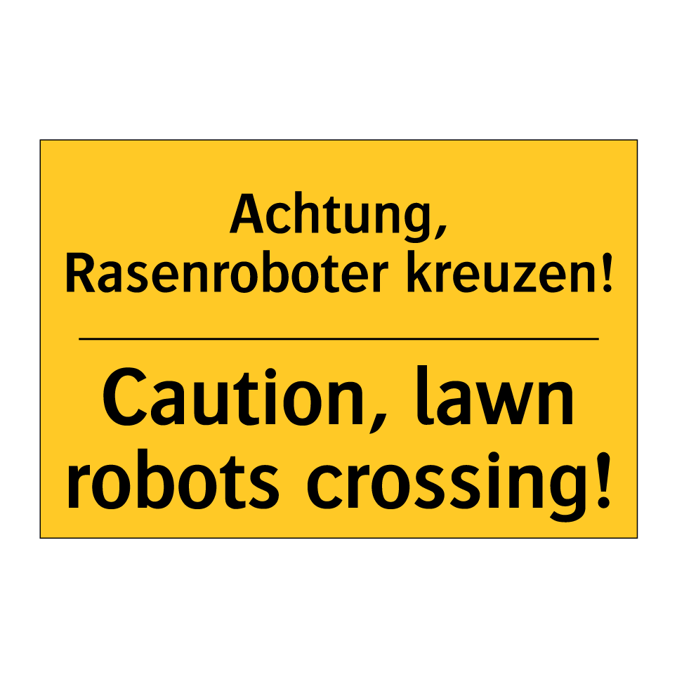 Zweisprachiges Warnschild mit deutschem Text Achtung, Rasenroboter kreuzen! und englischem Text Caution, lawn robots crossing!