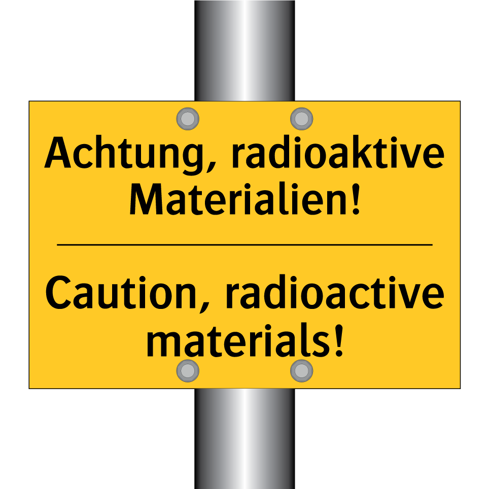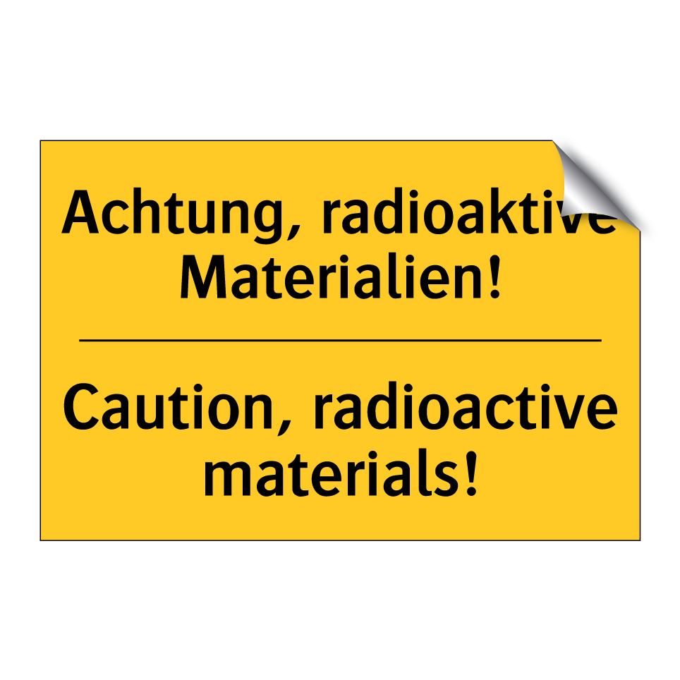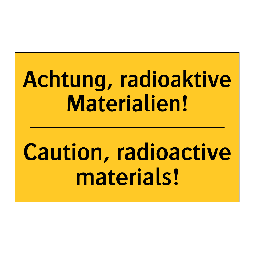 Zweisprachiges Warnschild mit deutschem Text Achtung, radioaktive Materialien! und englischem Text Caution, radioactive materials!