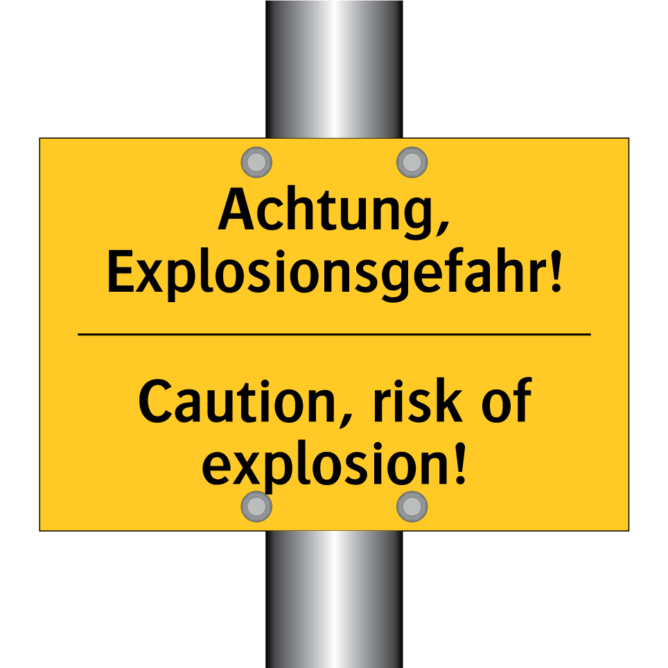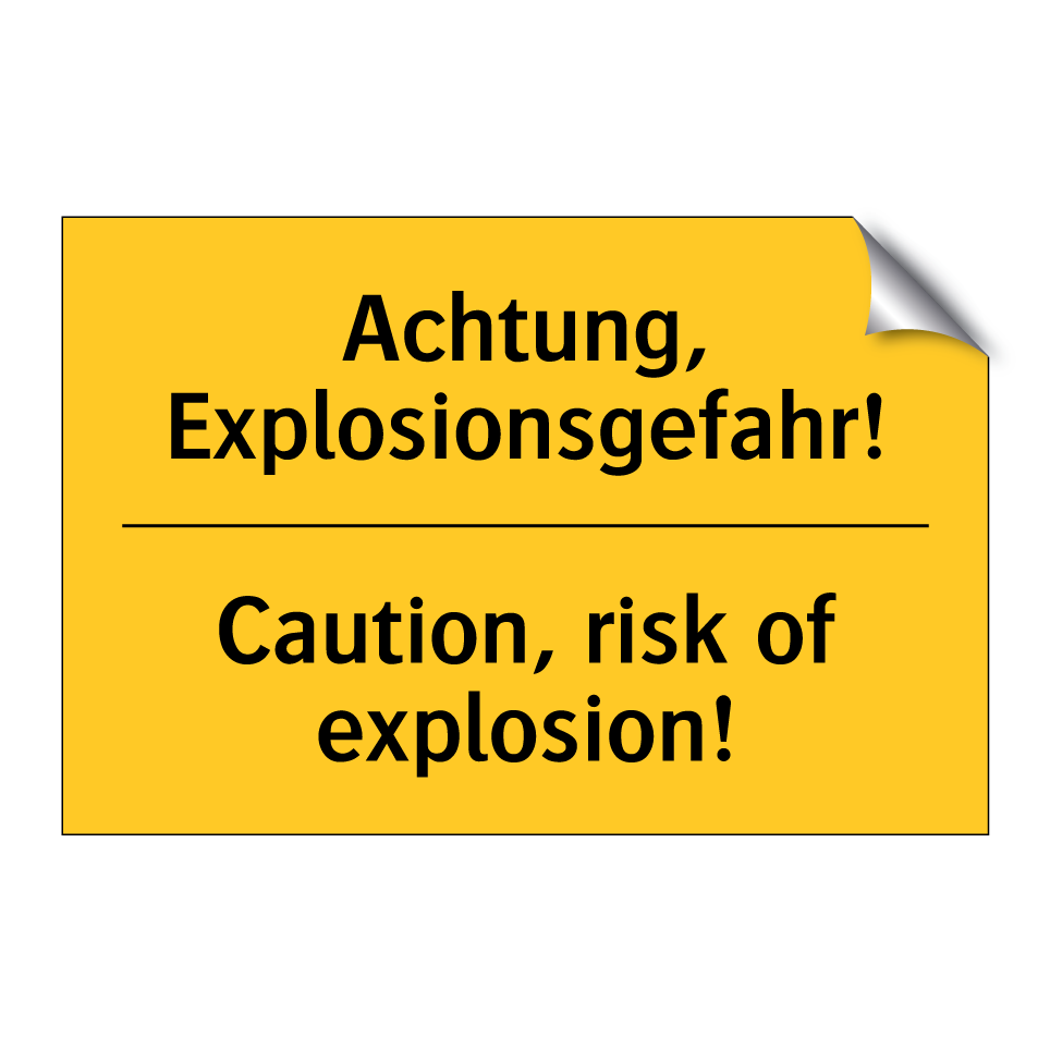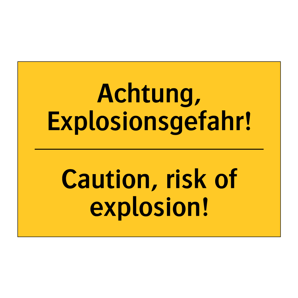 Zweisprachiges Warnschild mit deutschem Text Achtung, Explosionsgefahr! und englischem Text Caution, risk of explosion!