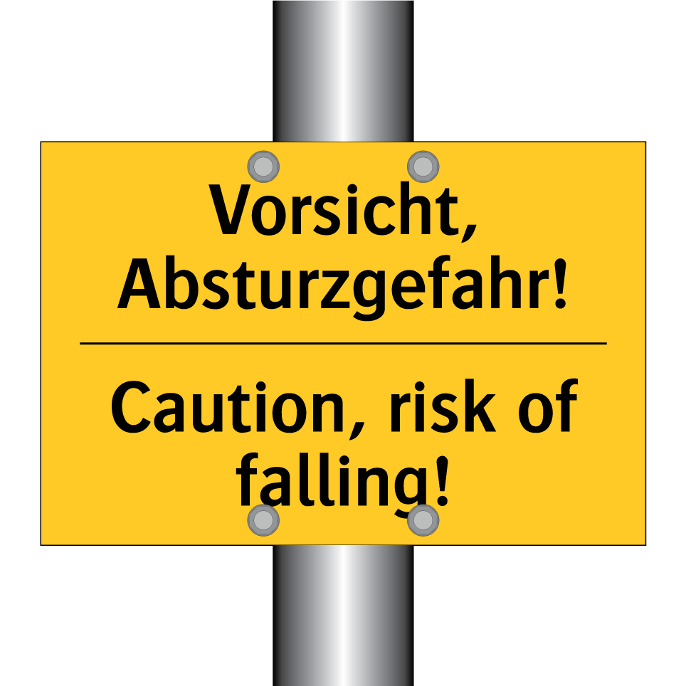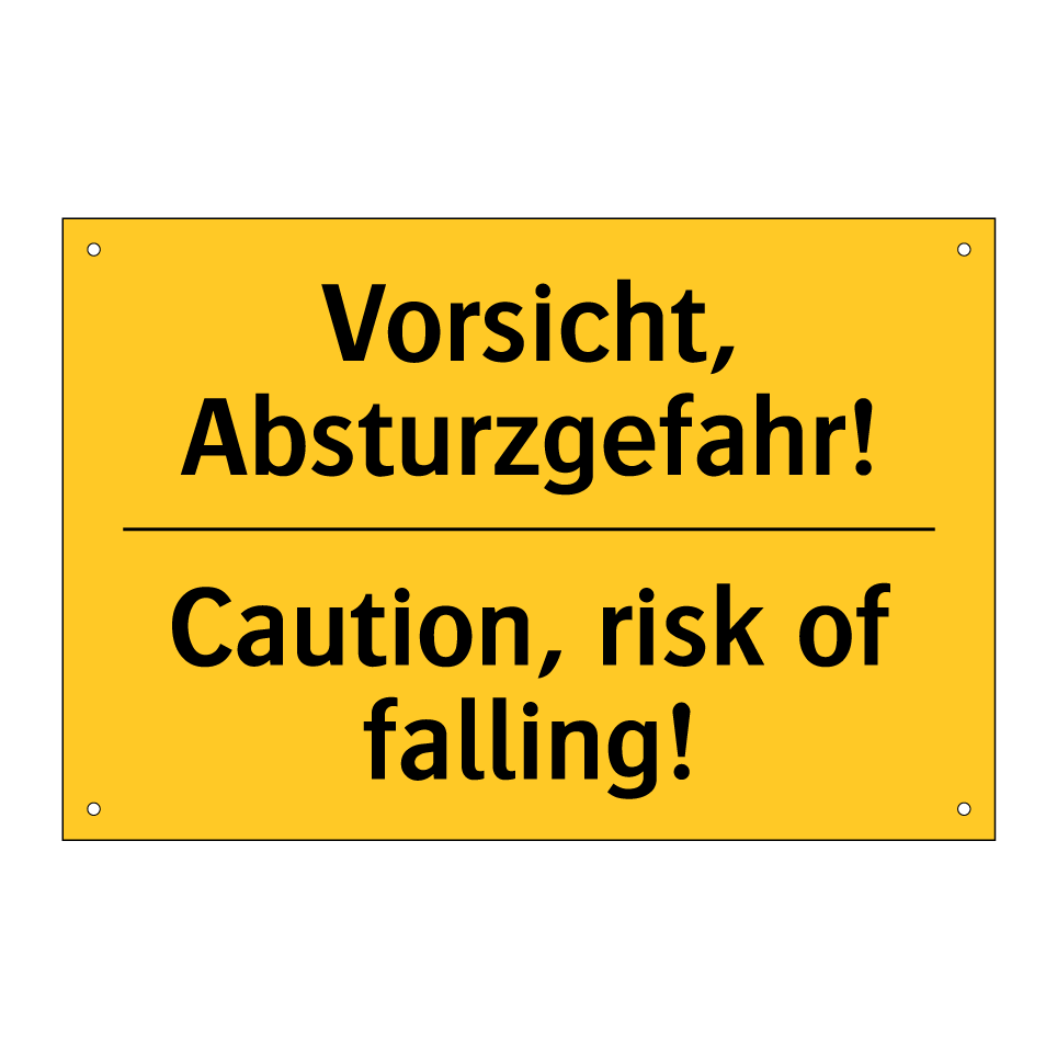 Zweisprachiges Warnschild mit deutschem Text Vorsicht, Absturzgefahr! und englischem Text Caution, risk of falling!