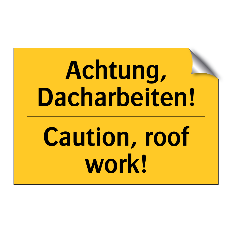 Zweisprachiges Warnschild mit deutschem Text Achtung, Dacharbeiten! und englischem Text Caution, roof work!