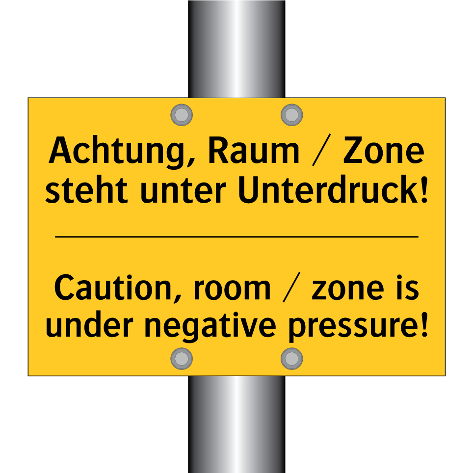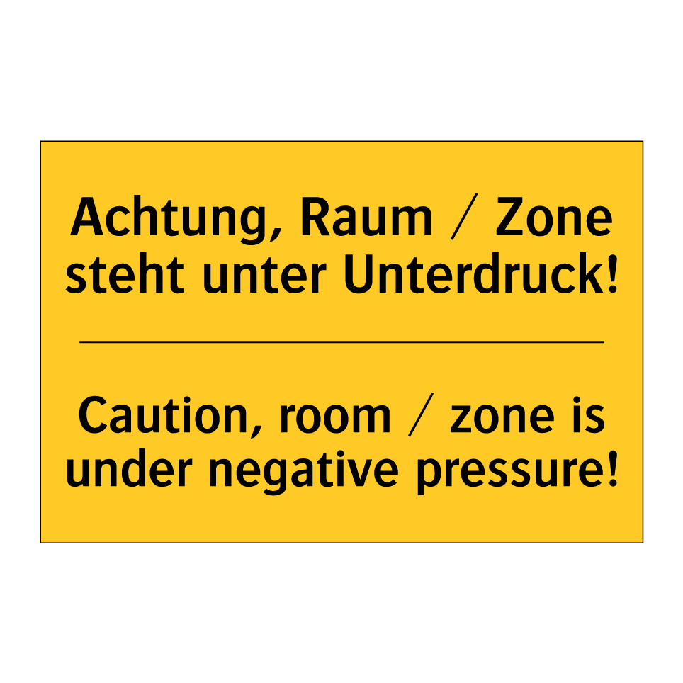 Zweisprachiges Warnschild mit deutschem Text Achtung, Raum / Zone steht unter Unterdruck! und englischem Text Caution, room / zone is under negative pressure!