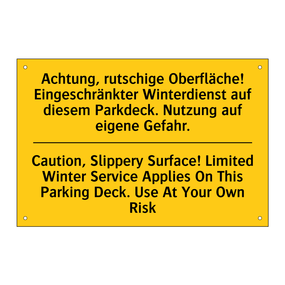Zweisprachiges Warnschild mit deutschem Text Achtung, rutschige Oberfläche! Eingeschränkter Winterdienst auf diesem Parkdeck. Nutzung auf eigene Gefahr. und englischem Text Caution, Slippery Surface! Limited Winter Service Applies On This Parking Deck. Use At Your Own Risk