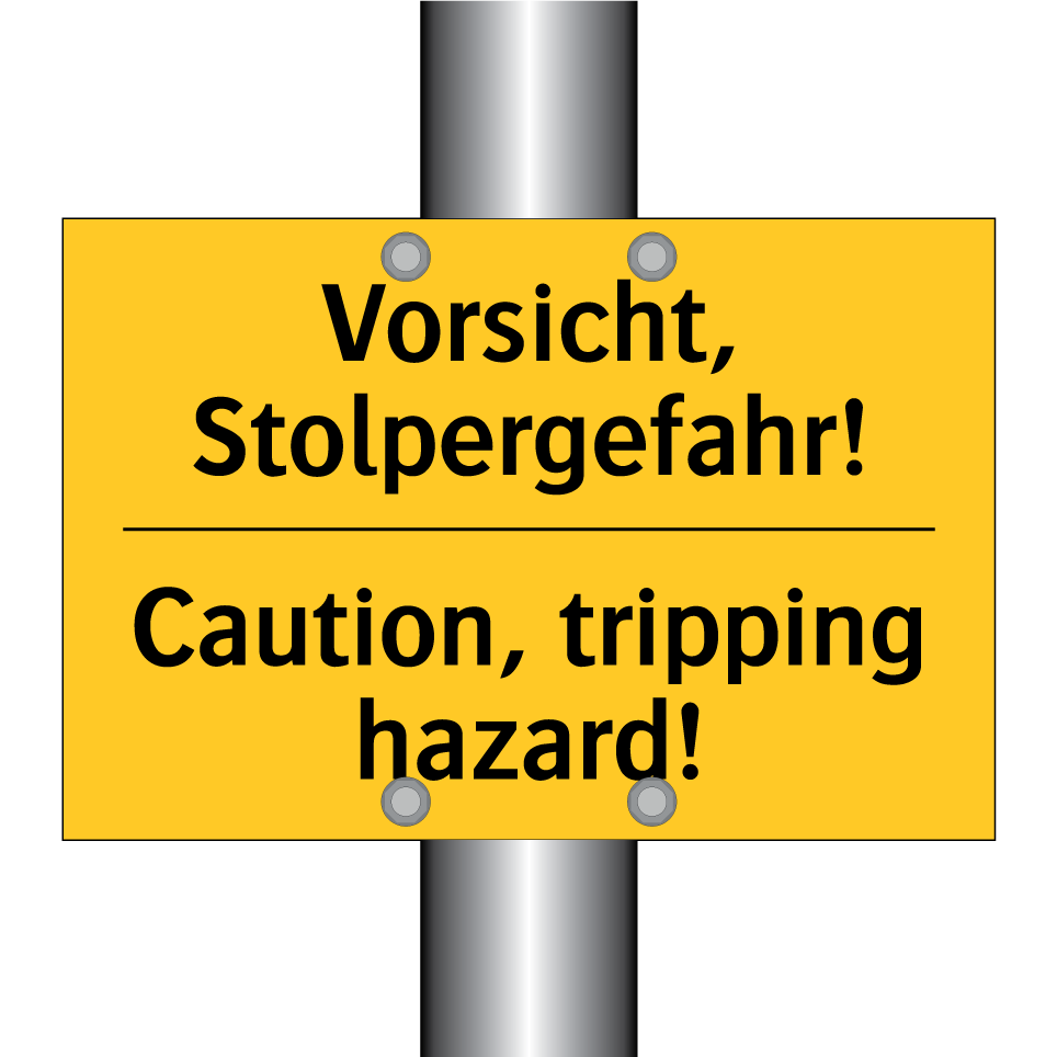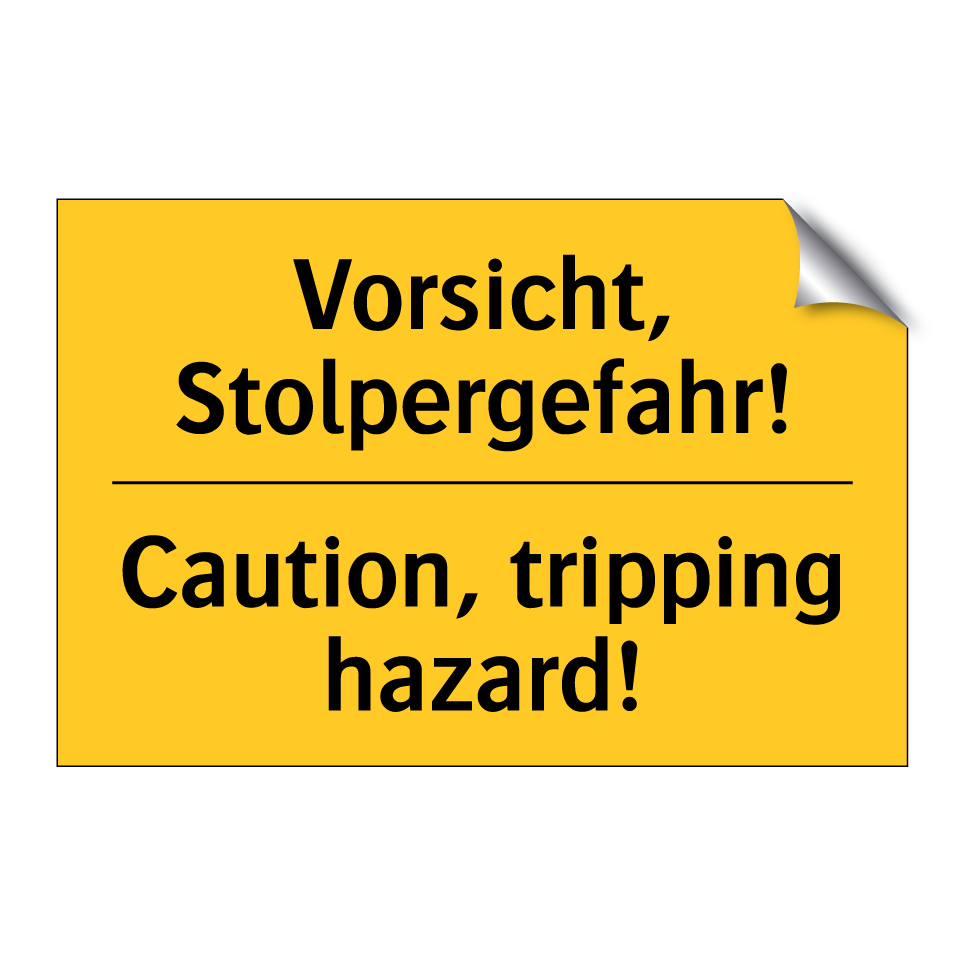 Zweisprachiges Warnschild mit deutschem Text Vorsicht, Stolpergefahr! und englischem Text Caution, tripping hazard!