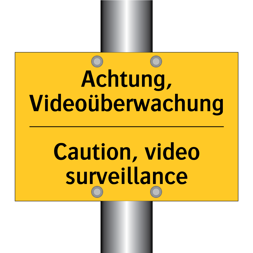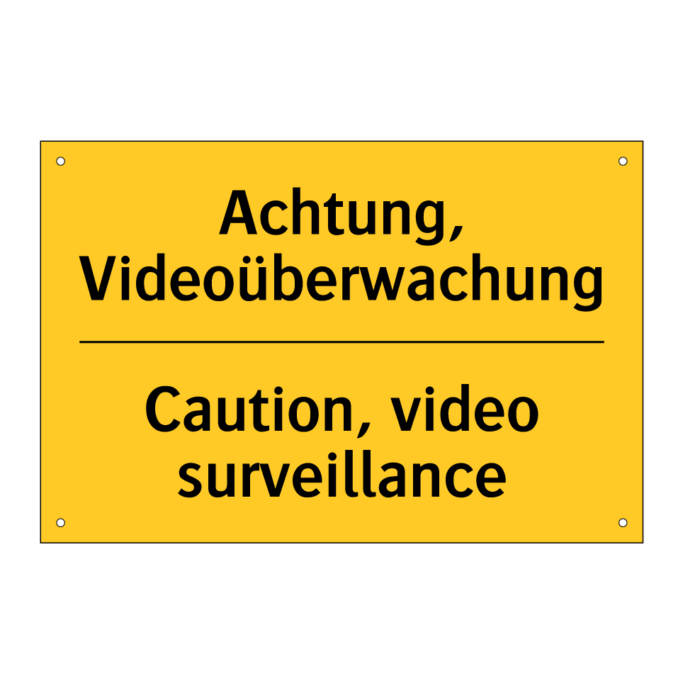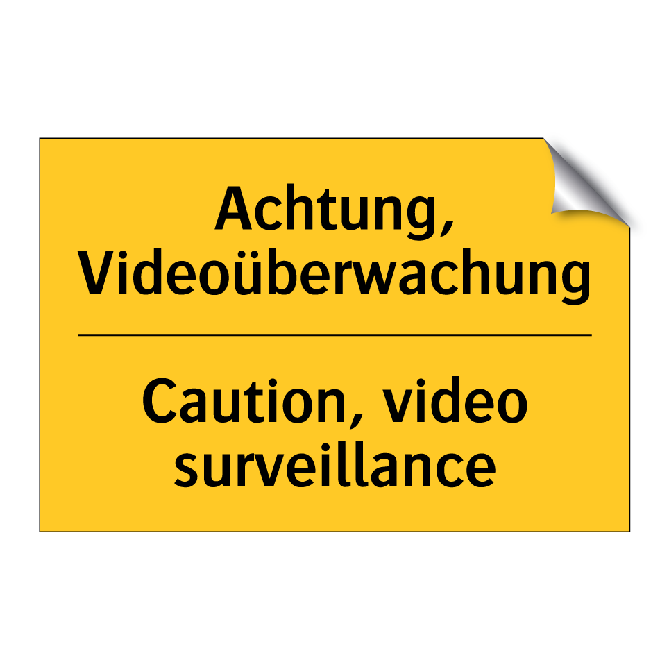 Zweisprachiges Warnschild mit deutschem Text Achtung, Videoüberwachung und englischem Text Caution, video surveillance