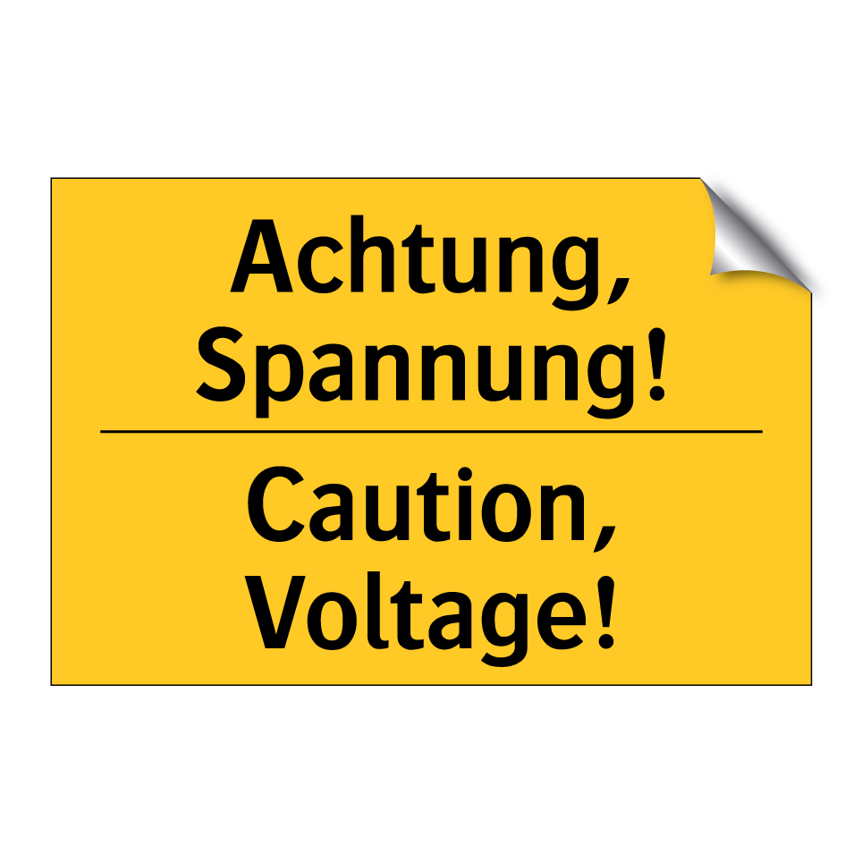 Zweisprachiges Warnschild mit deutschem Text Achtung, Spannung! und englischem Text Caution, Voltage!
