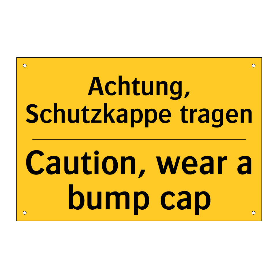 Zweisprachiges Warnschild mit deutschem Text Achtung, Schutzkappe tragen und englischem Text Caution, wear a bump cap