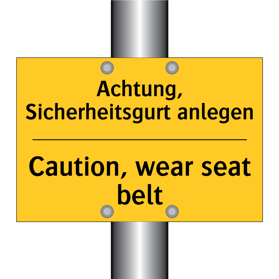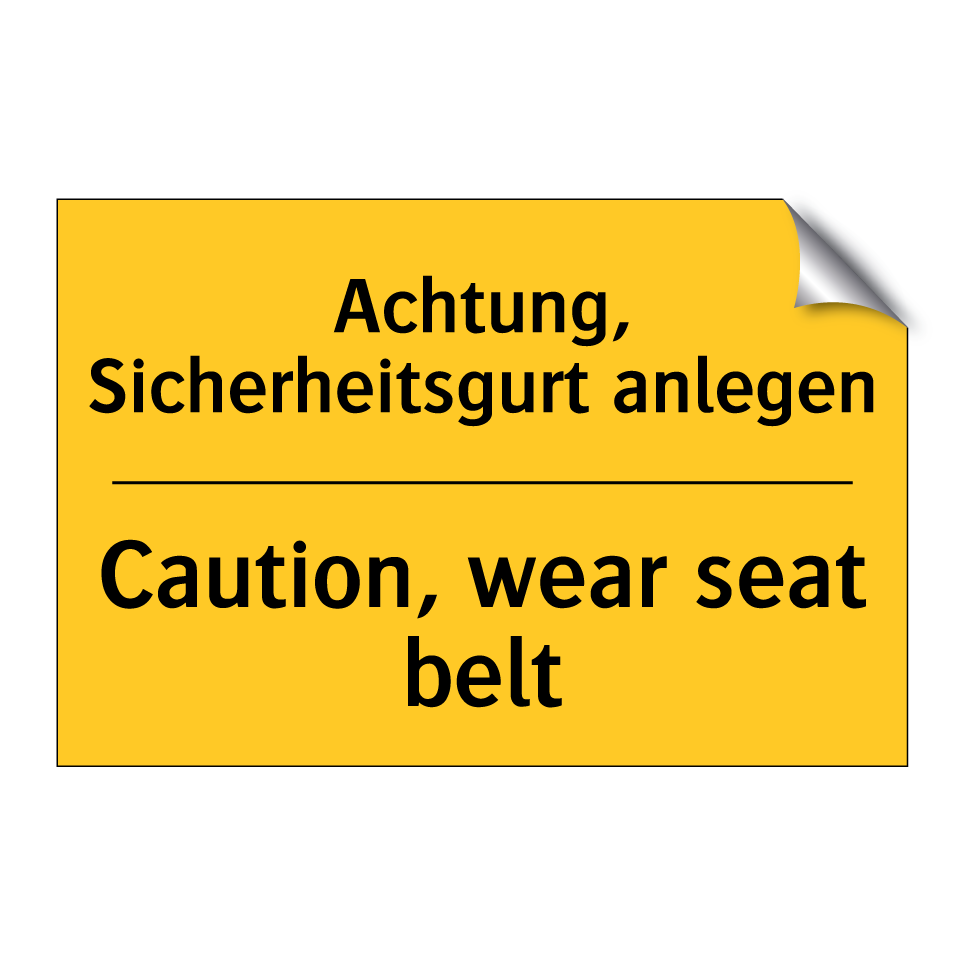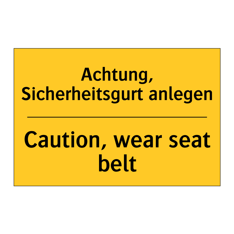 Zweisprachiges Warnschild mit deutschem Text Achtung, Sicherheitsgurt anlegen und englischem Text Caution, wear seat belt