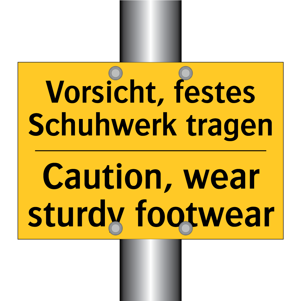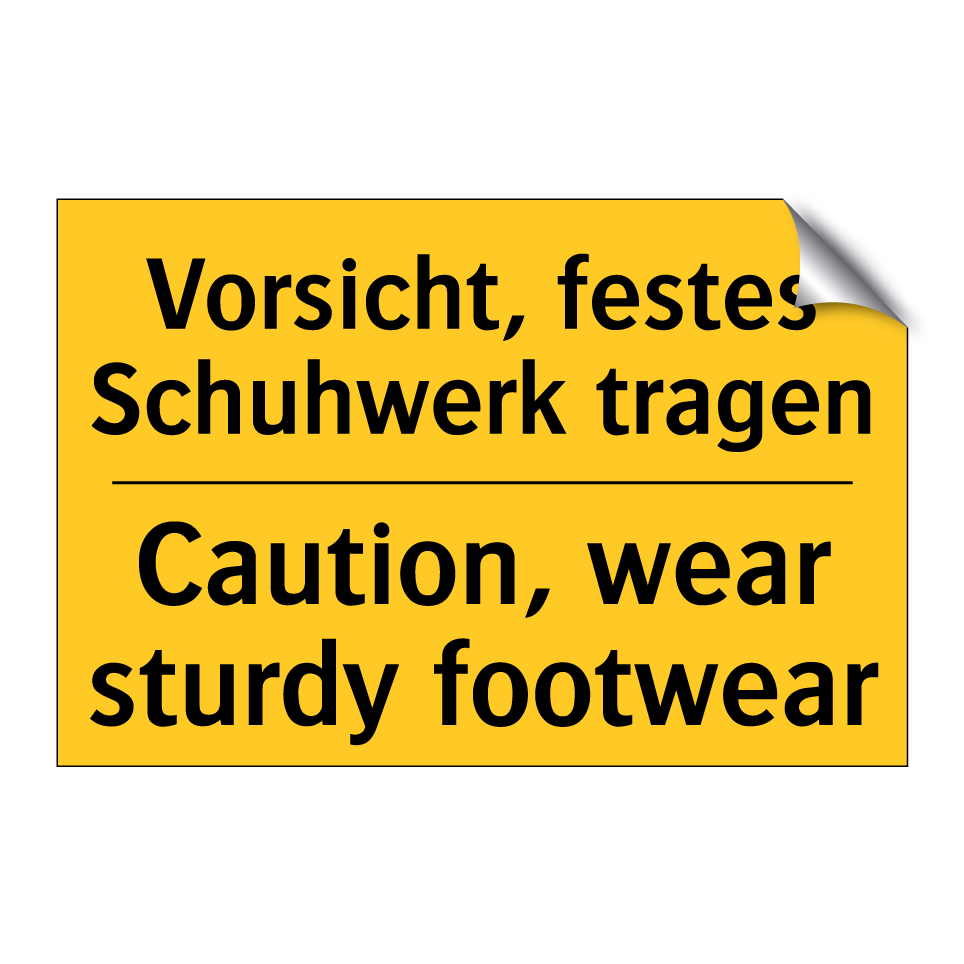 Zweisprachiges Warnschild mit deutschem Text Vorsicht, festes Schuhwerk tragen und englischem Text Caution, wear sturdy footwear