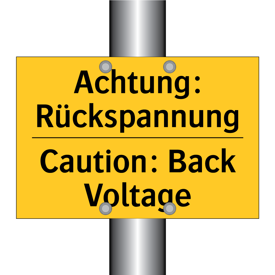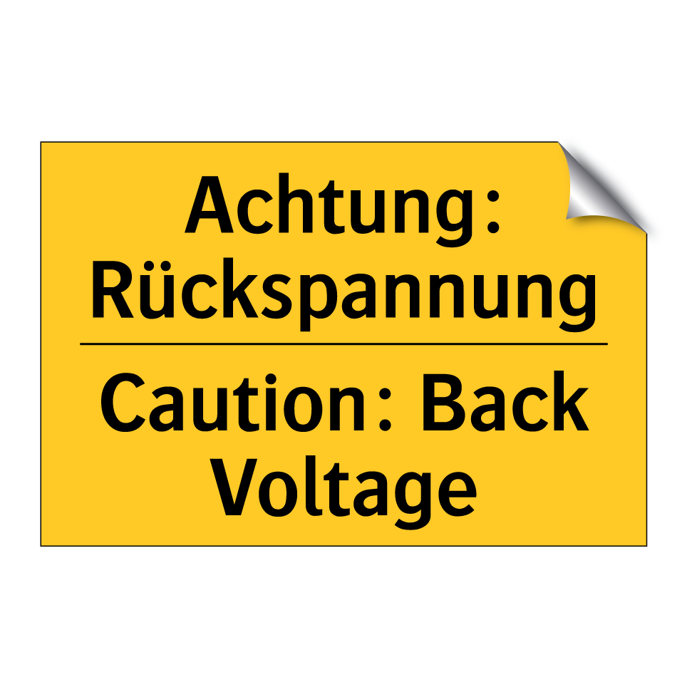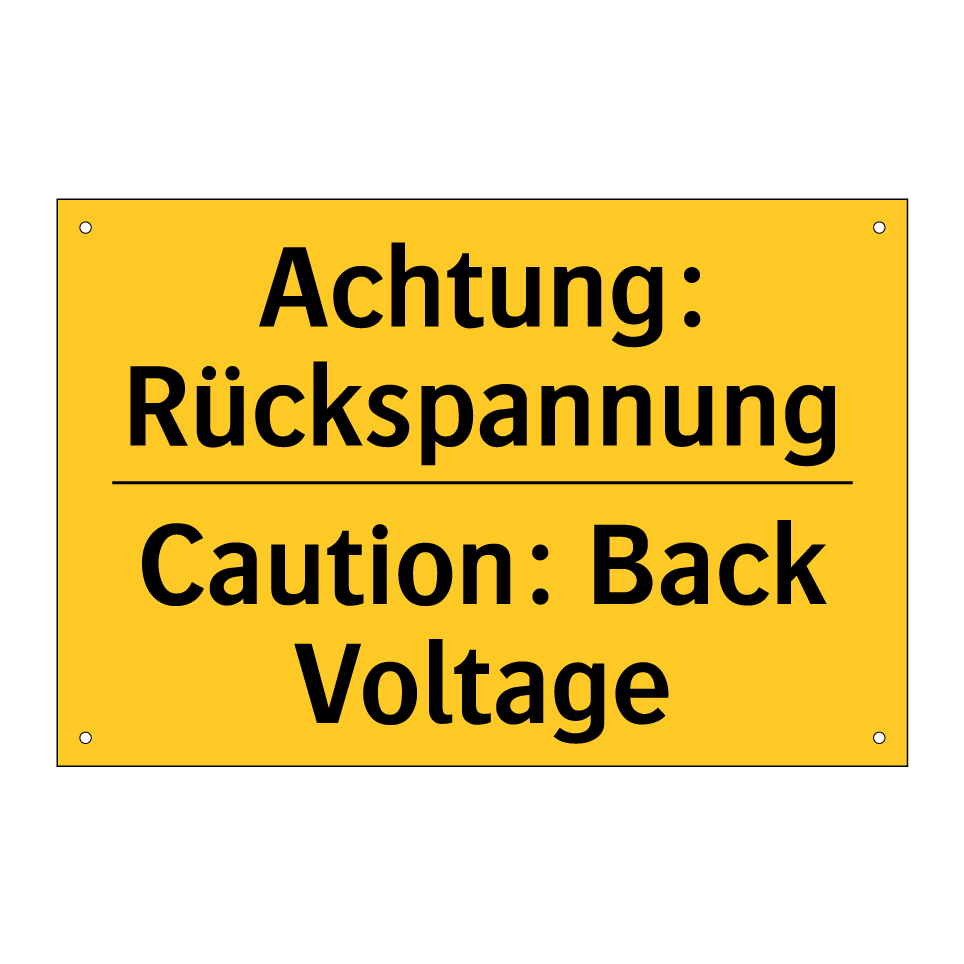 Zweisprachiges Warnschild mit deutschem Text Achtung: Rückspannung und englischem Text Caution: Back Voltage