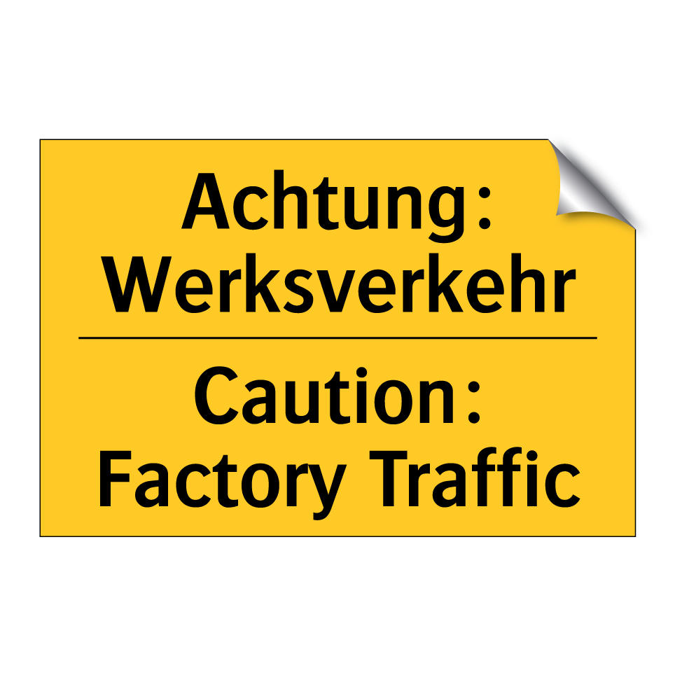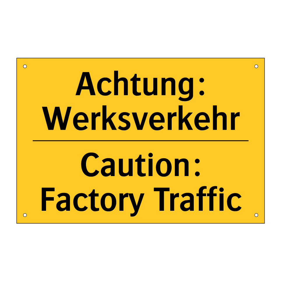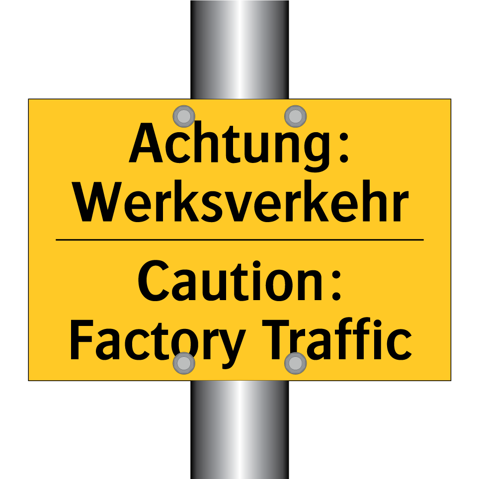 Zweisprachiges Warnschild mit deutschem Text Achtung: Werksverkehr und englischem Text Caution: Factory Traffic