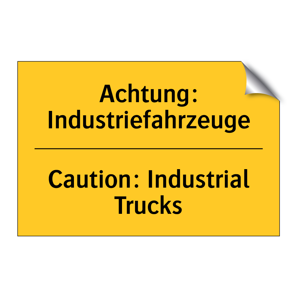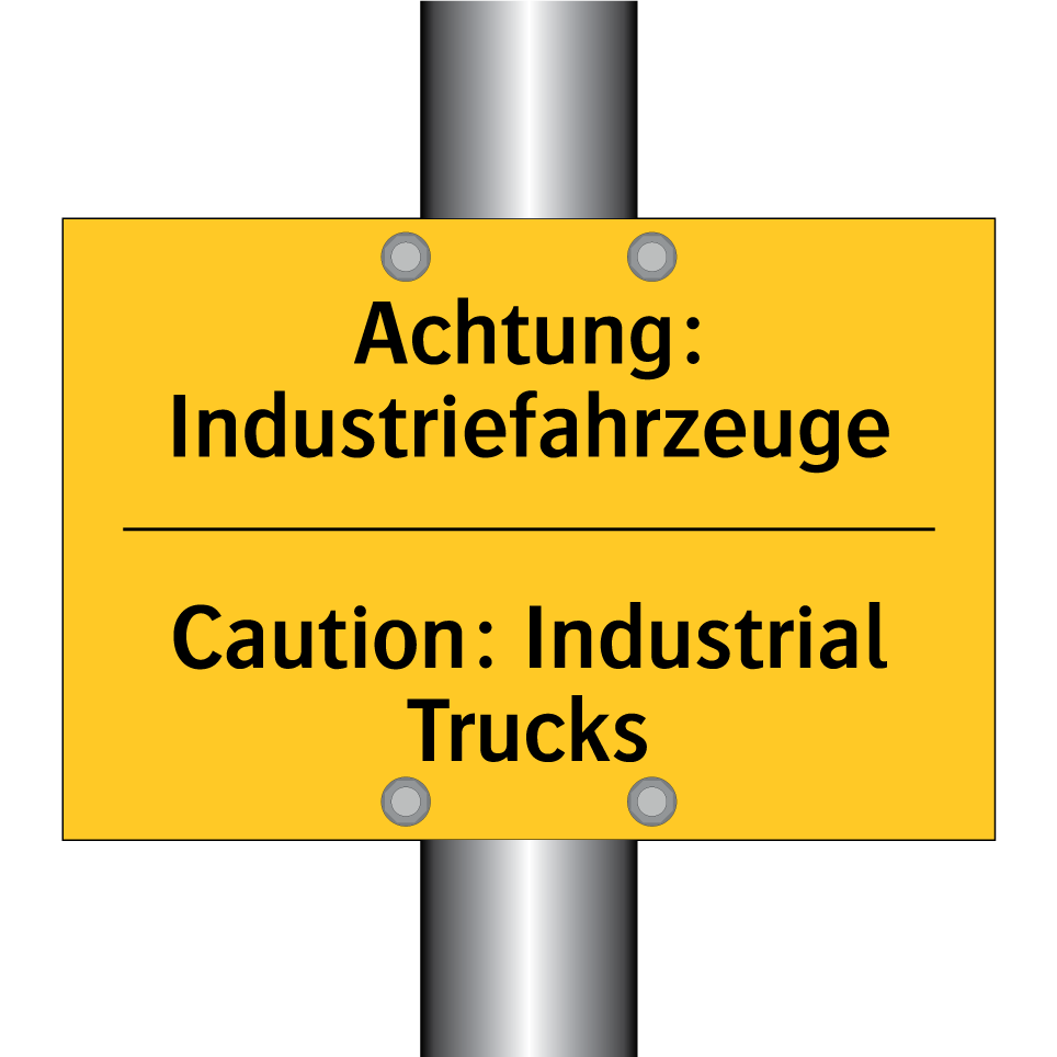 Zweisprachiges Warnschild mit deutschem Text Achtung: Industriefahrzeuge und englischem Text Caution: Industrial Trucks