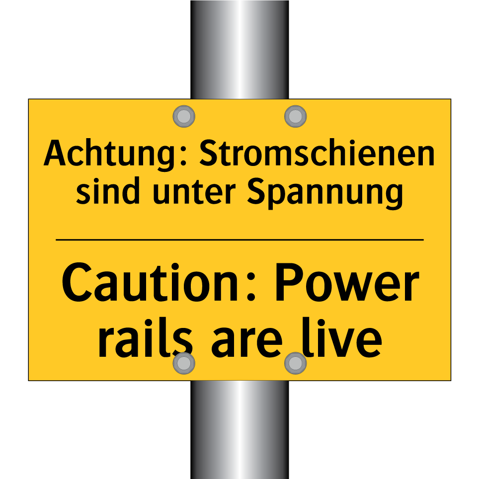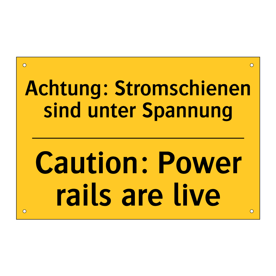Zweisprachiges Warnschild mit deutschem Text Achtung: Stromschienen sind unter Spannung und englischem Text Caution: Power rails are live