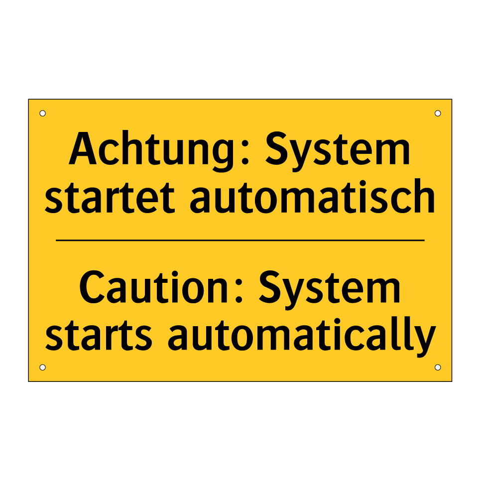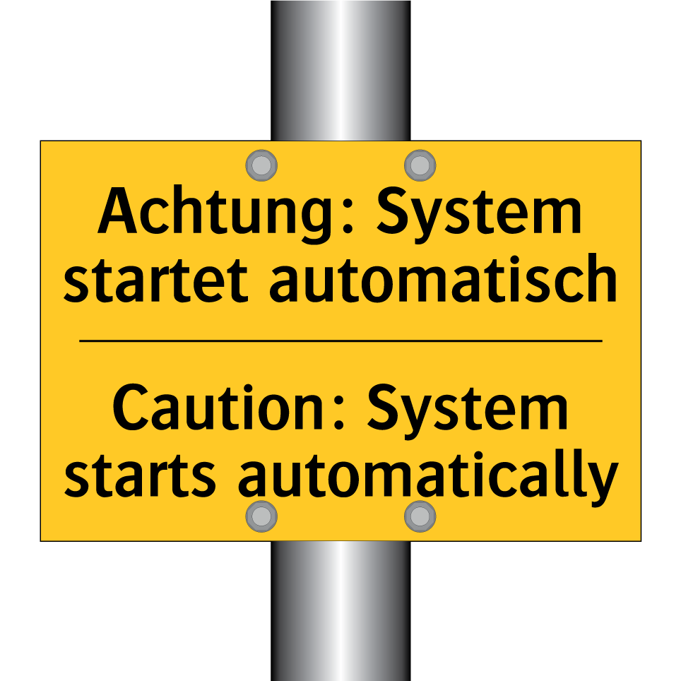 Zweisprachiges Warnschild mit deutschem Text Achtung: System startet automatisch und englischem Text Caution: System starts automatically