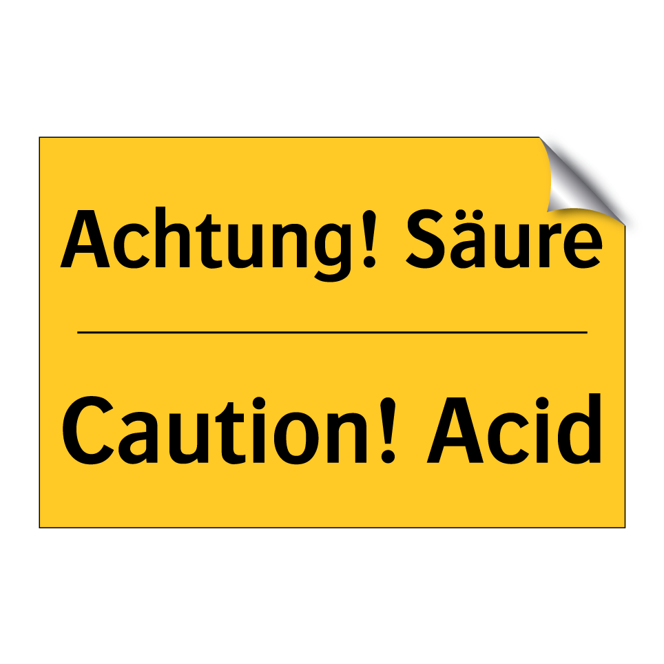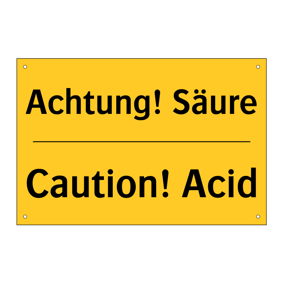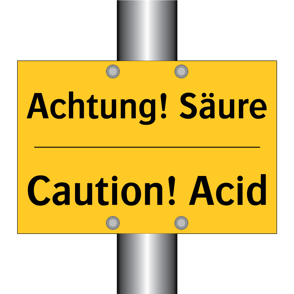 Zweisprachiges Warnschild mit deutschem Text Achtung! Säure und englischem Text Caution! Acid