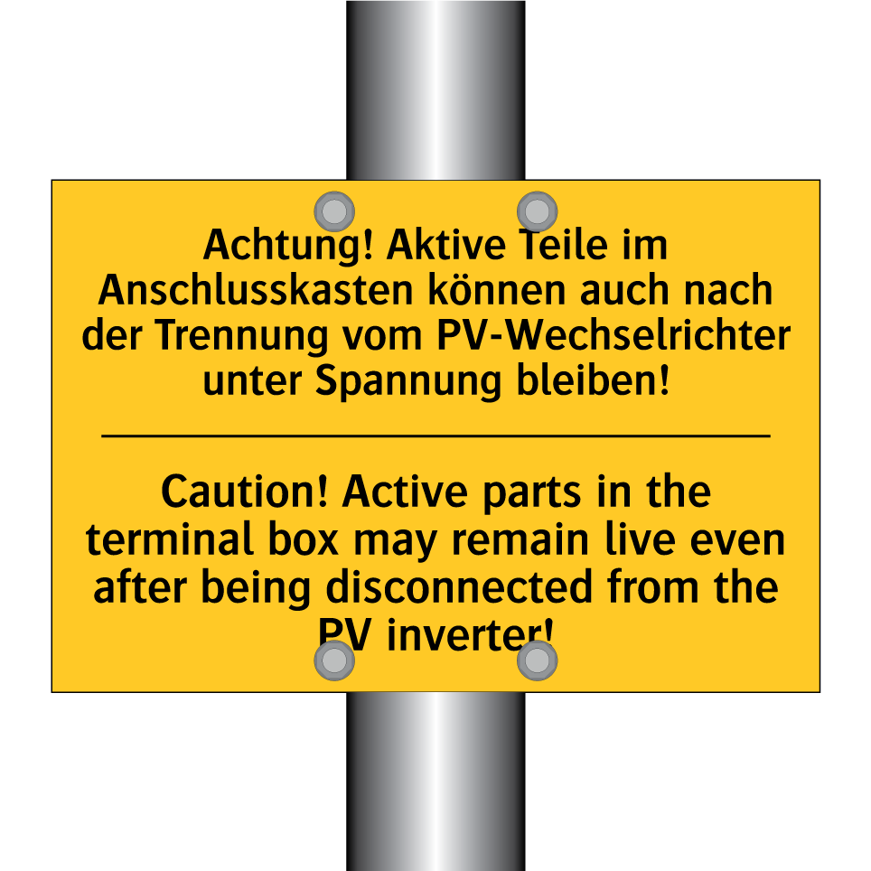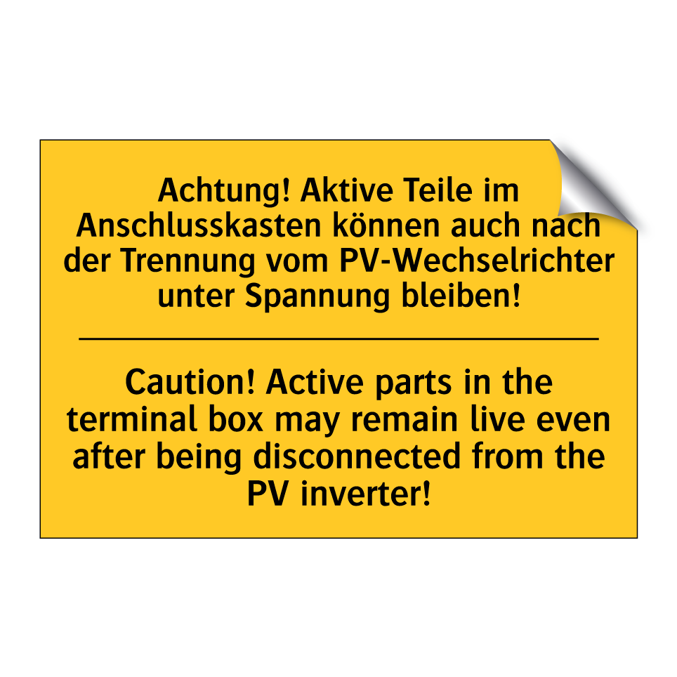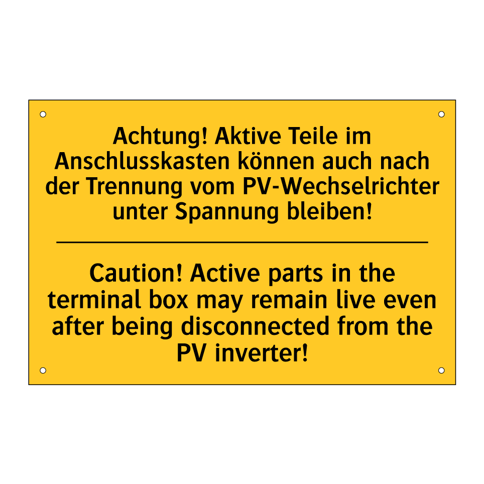 Zweisprachiges Warnschild mit deutschem Text Achtung! Aktive Teile im Anschlusskasten können auch nach der Trennung vom PV-Wechselrichter unter Spannung bleiben! und englischem Text Caution! Active parts in the terminal box may remain live even after being disconnected from the PV inverter!