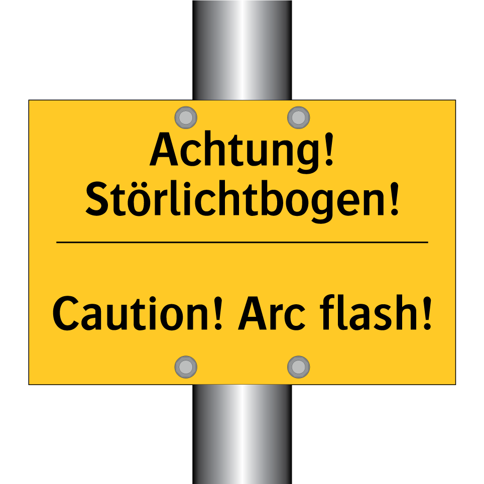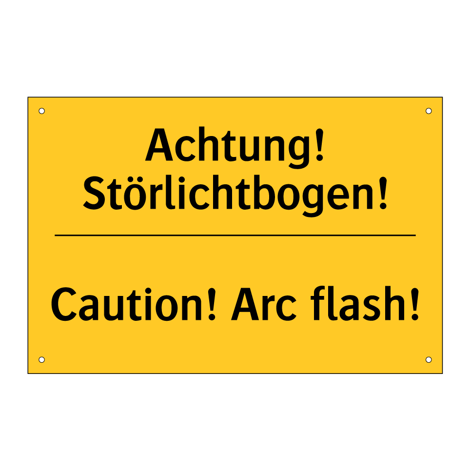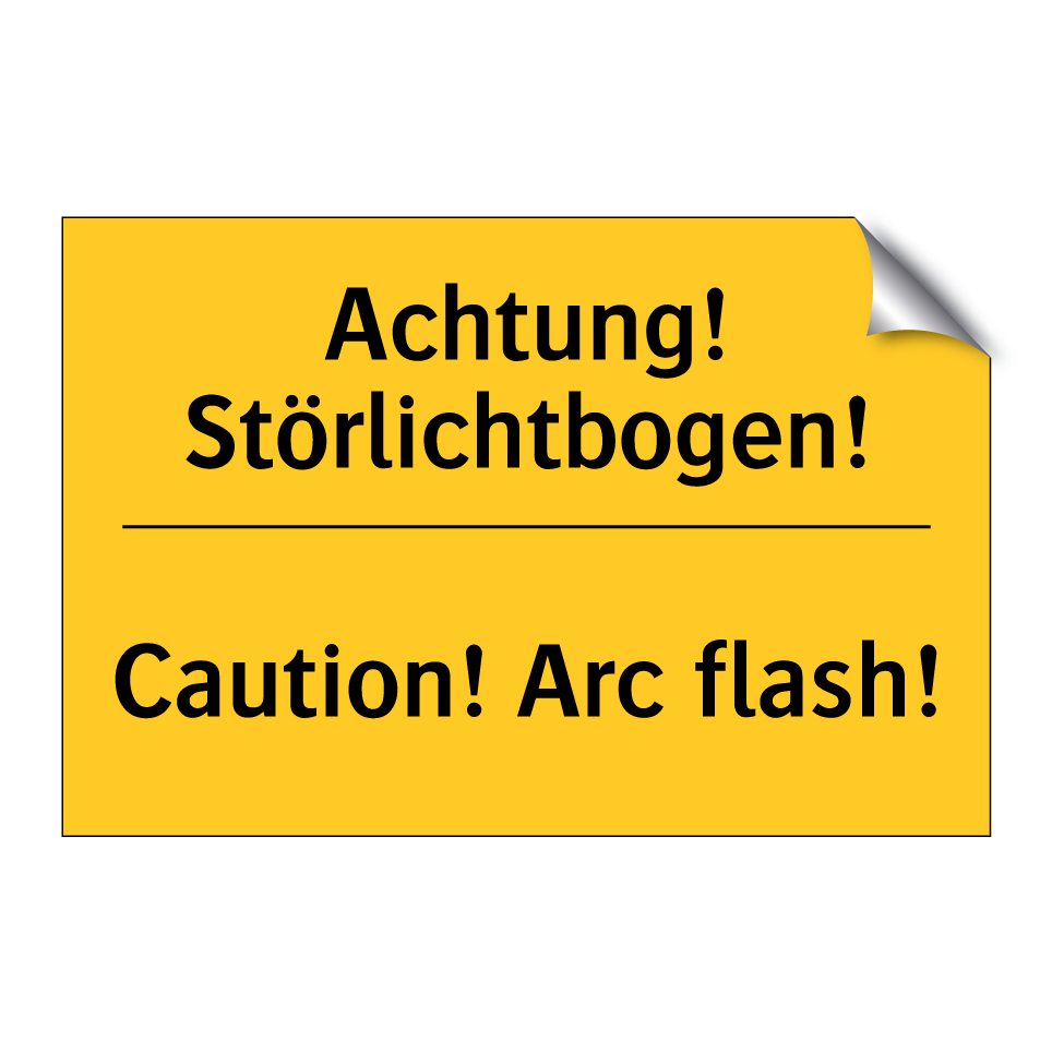 Zweisprachiges Warnschild mit deutschem Text Achtung! Störlichtbogen! und englischem Text Caution! Arc flash!