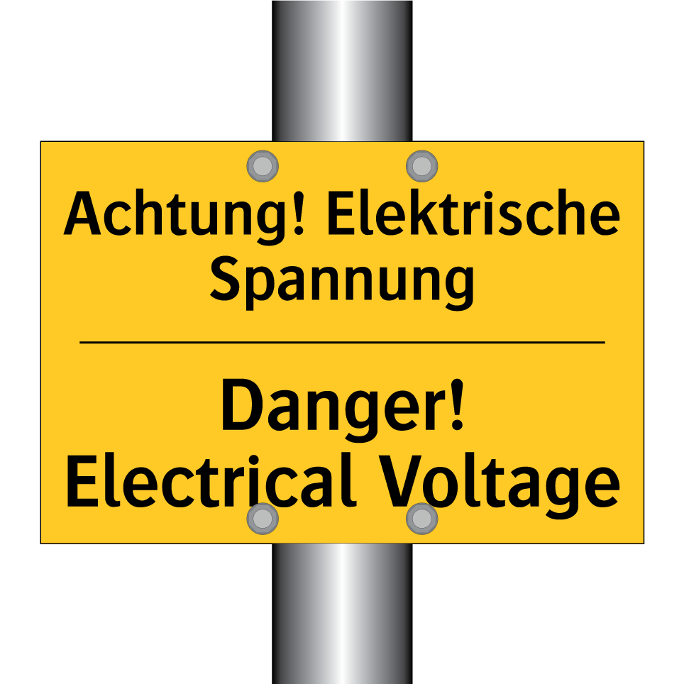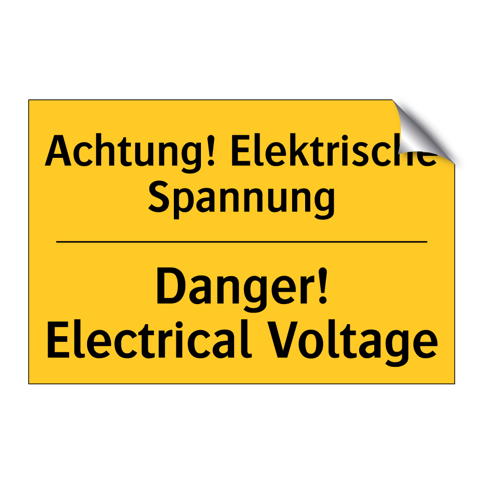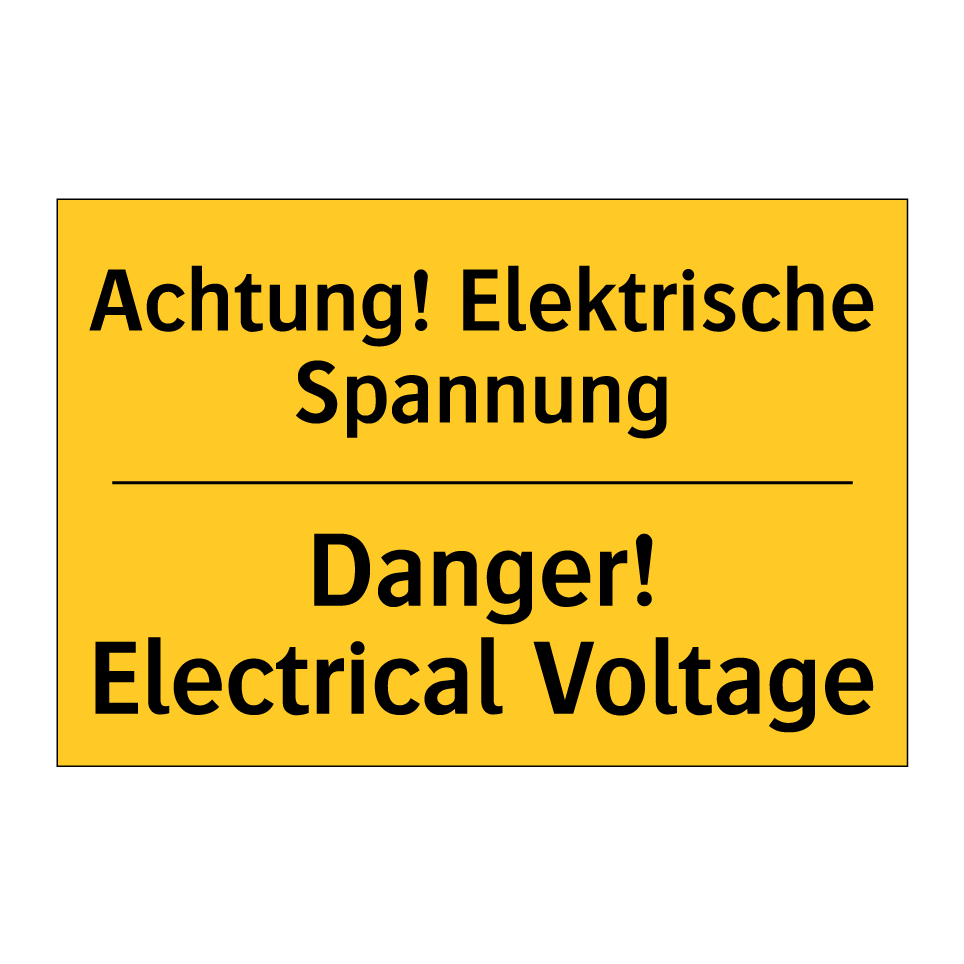 Zweisprachiges Warnschild mit deutschem Text Achtung! Elektrische Spannung und englischem Text Danger! Electrical Voltage