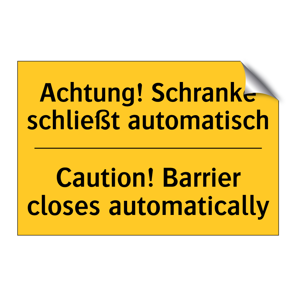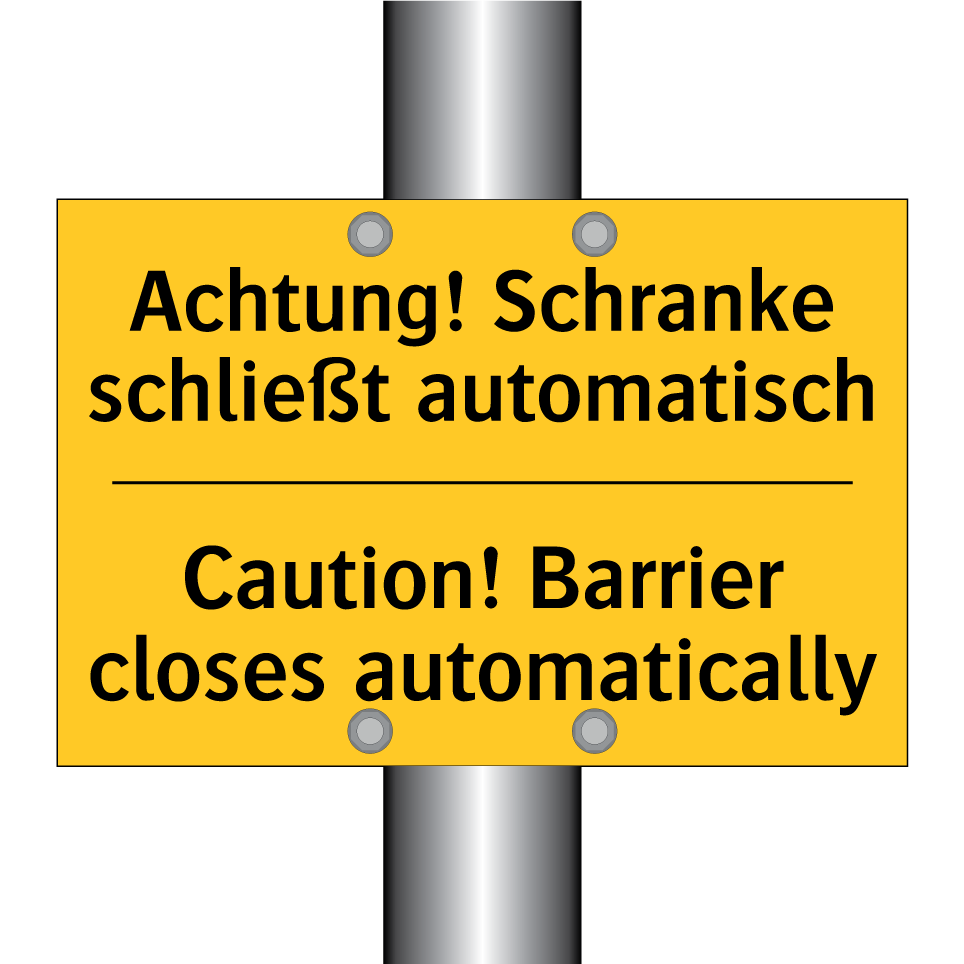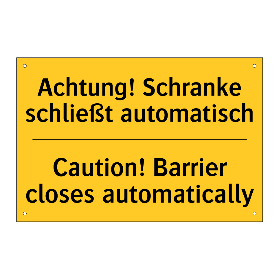 Zweisprachiges Warnschild mit deutschem Text Achtung! Schranke schließt automatisch und englischem Text Caution! Barrier closes automatically