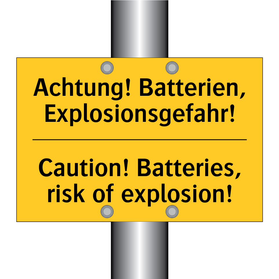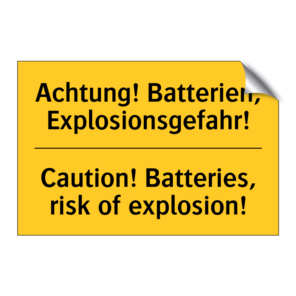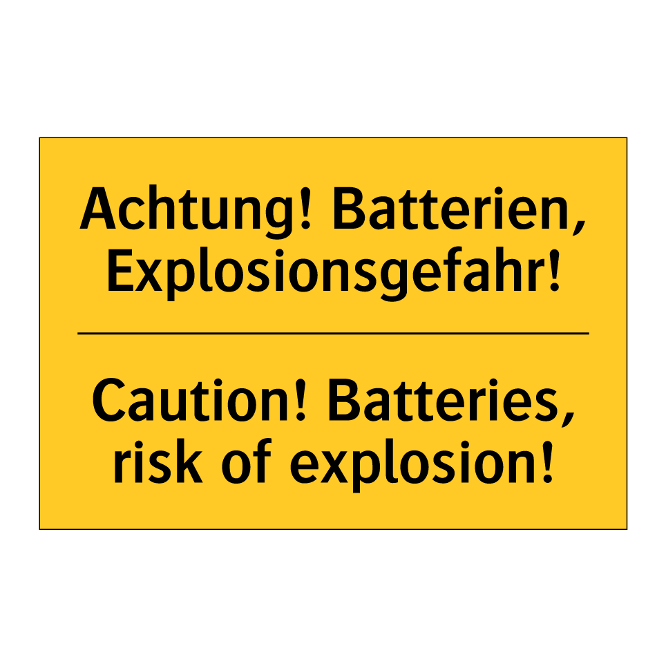 Zweisprachiges Warnschild mit deutschem Text Achtung! Batterien, Explosionsgefahr! und englischem Text Caution! Batteries, risk of explosion!