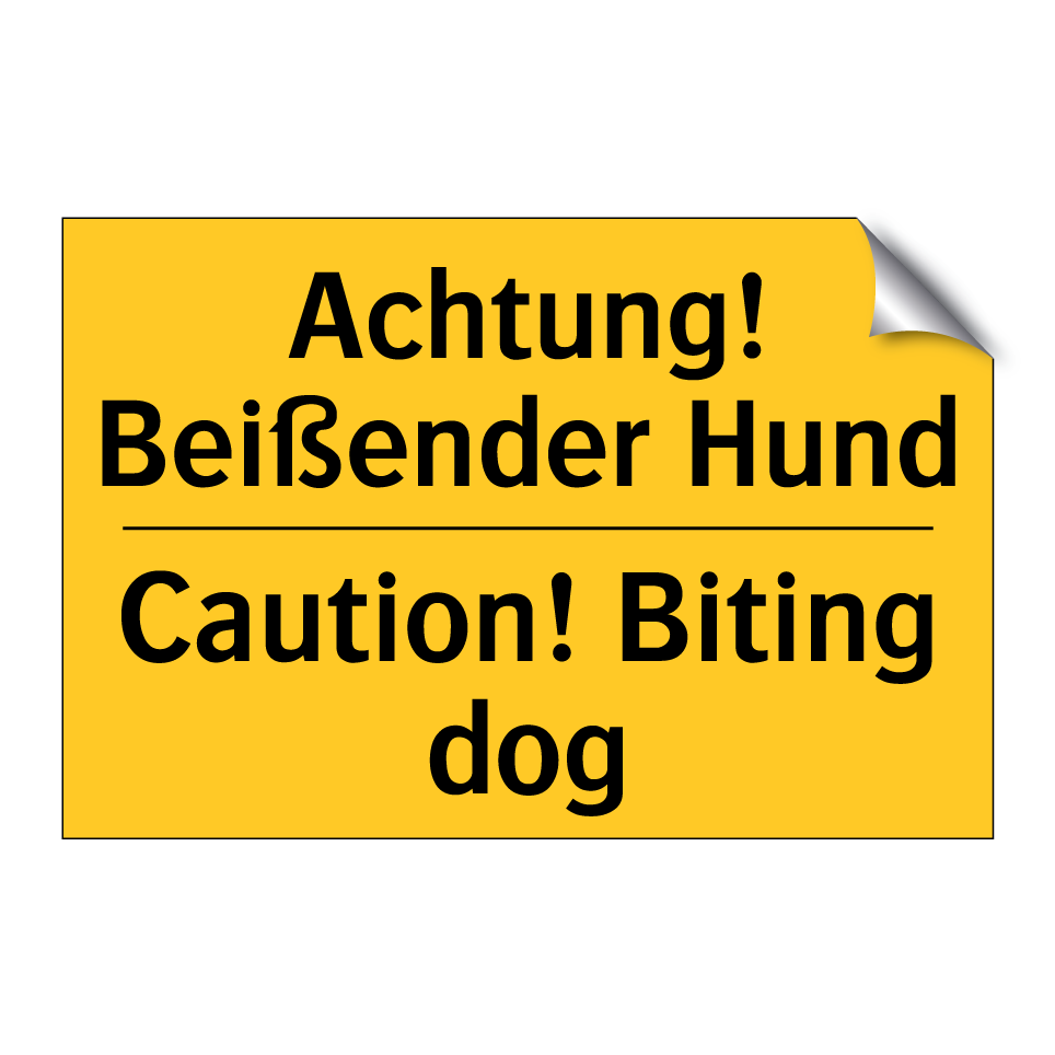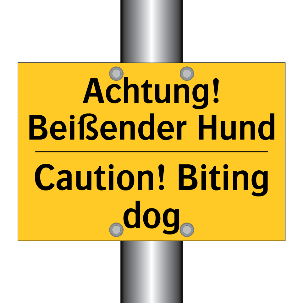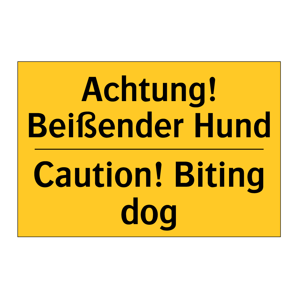 Zweisprachiges Warnschild mit deutschem Text Achtung! Beißender Hund und englischem Text Caution! Biting dog