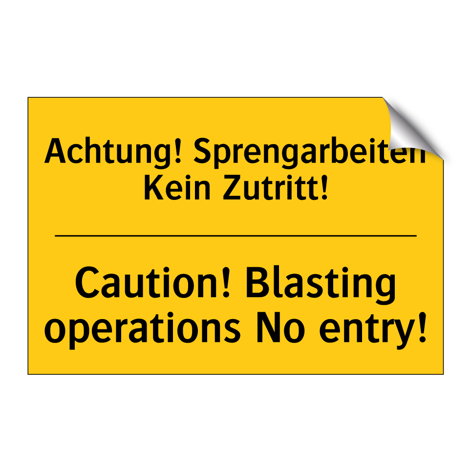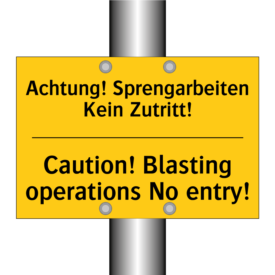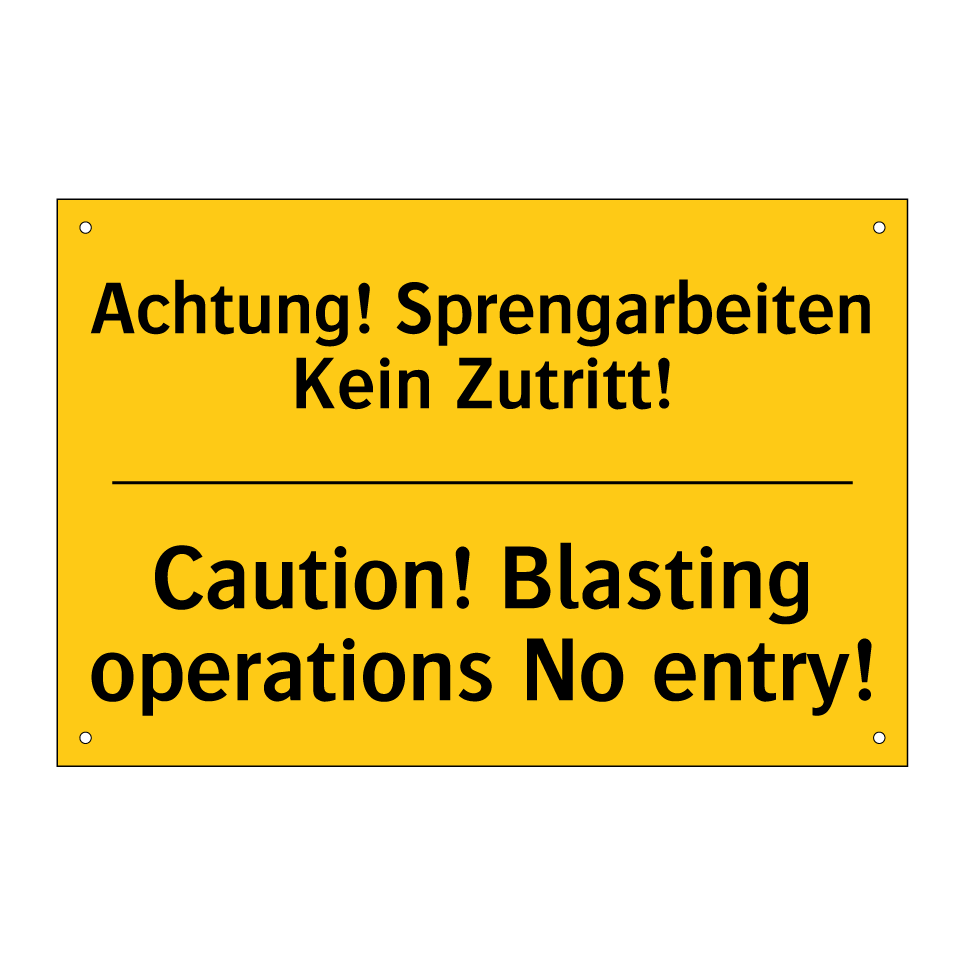 Zweisprachiges Warnschild mit deutschem Text Achtung! Sprengarbeiten Kein Zutritt! und englischem Text Caution! Blasting operations No entry!