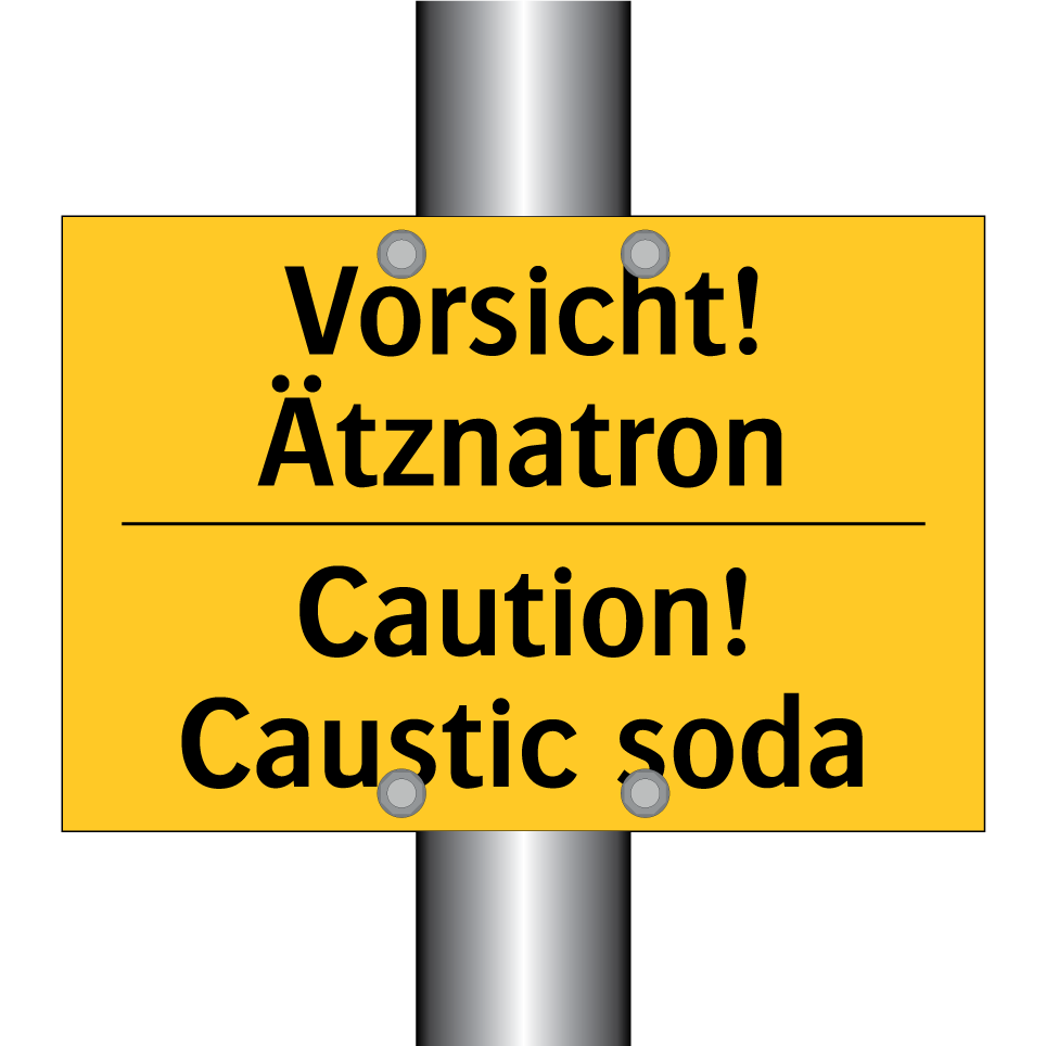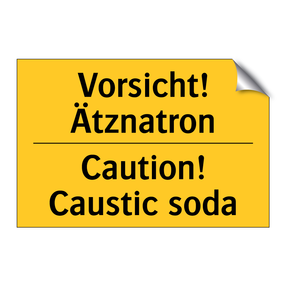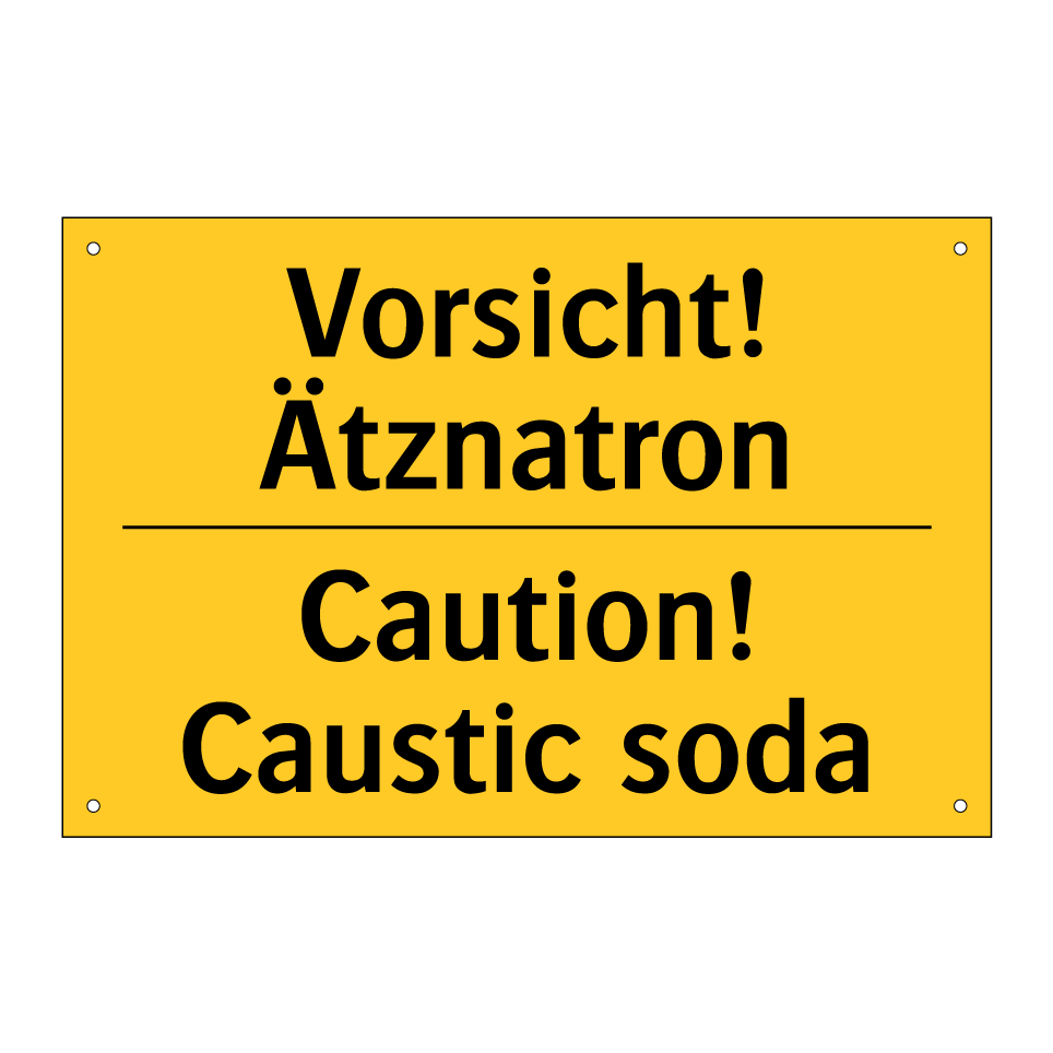 Zweisprachiges Warnschild mit deutschem Text Vorsicht! Ätznatron und englischem Text Caution! Caustic soda