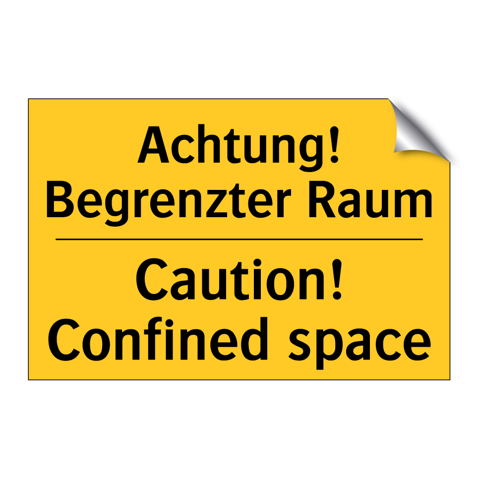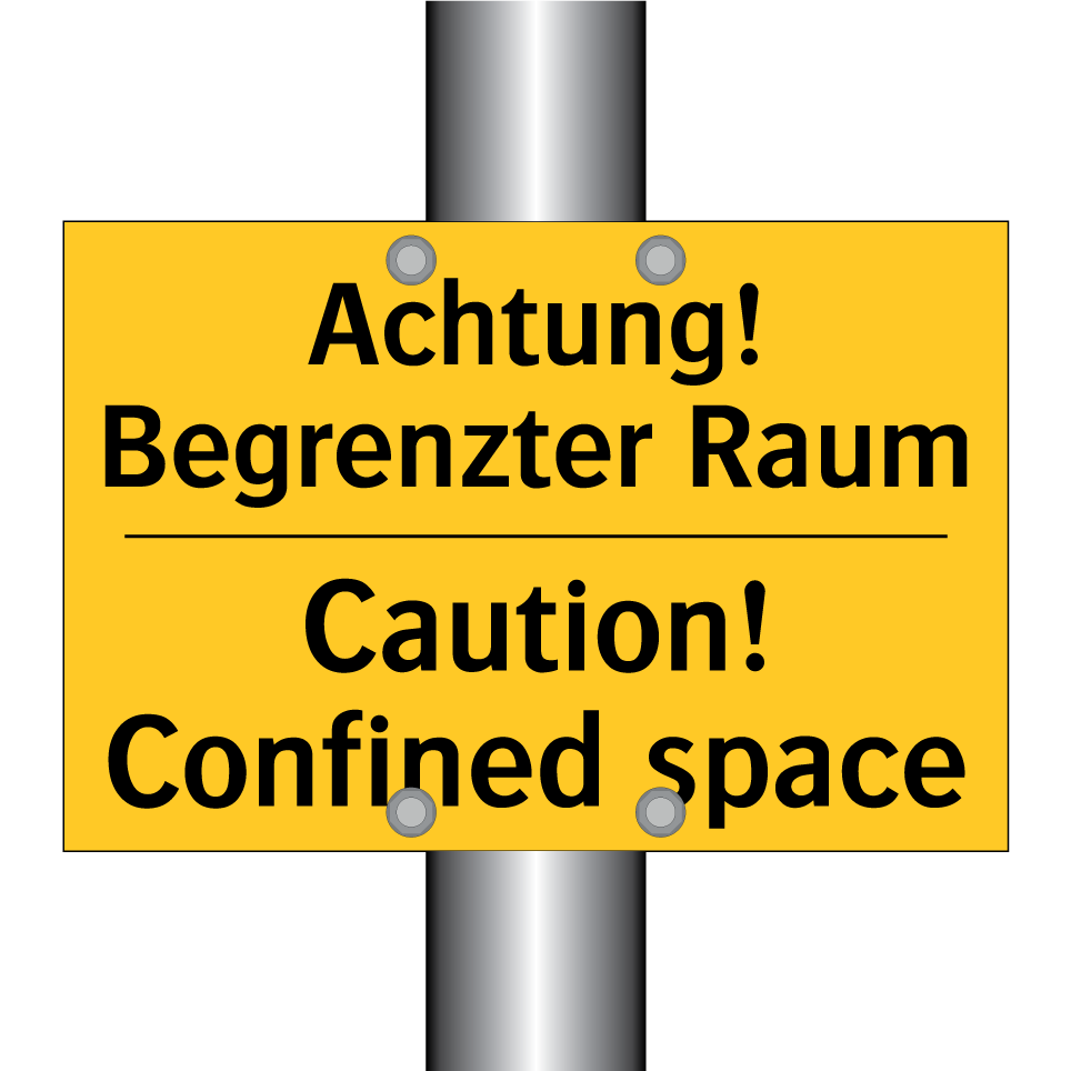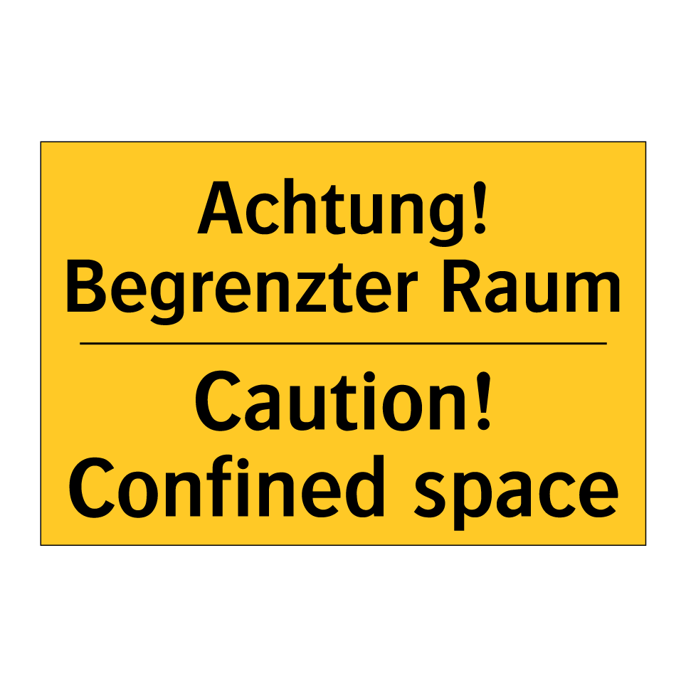 Zweisprachiges Warnschild mit deutschem Text Achtung! Begrenzter Raum und englischem Text Caution! Confined space