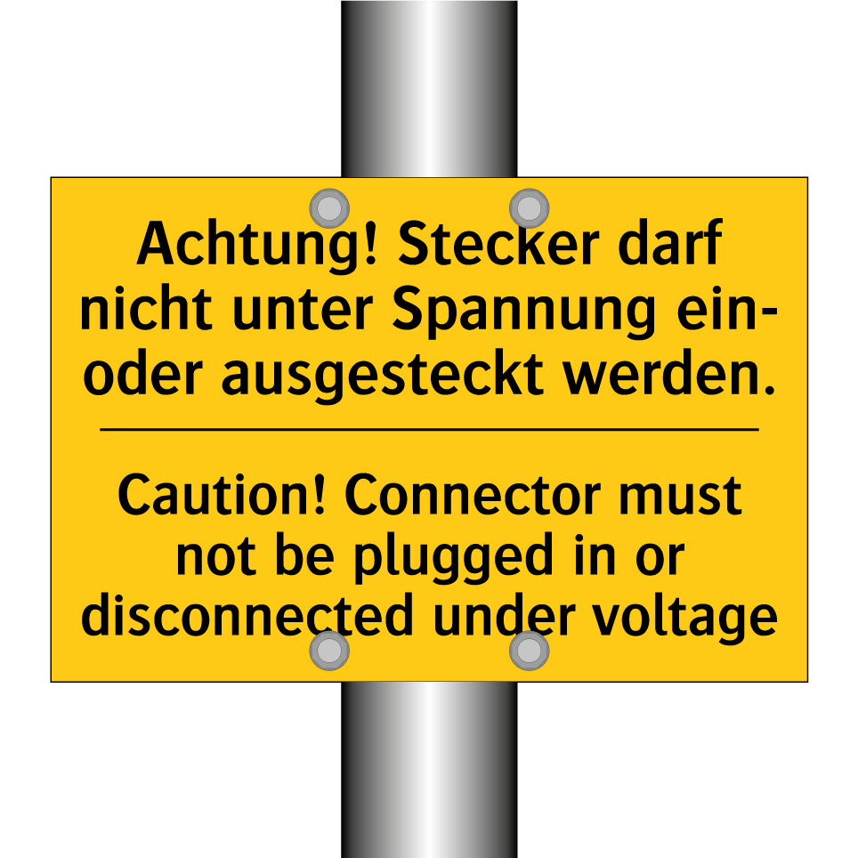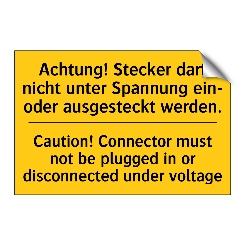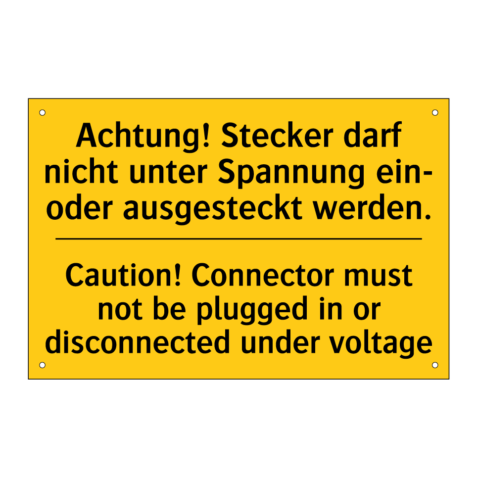Zweisprachiges Warnschild mit deutschem Text Achtung! Stecker darf nicht unter Spannung ein- oder ausgesteckt werden. und englischem Text Caution! Connector must not be plugged in or disconnected under voltage