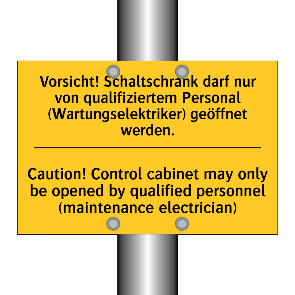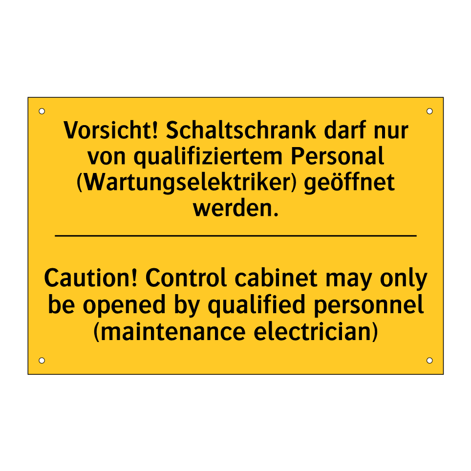 Zweisprachiges Warnschild mit deutschem Text Vorsicht! Schaltschrank darf nur von qualifiziertem Personal (Wartungselektriker) geöffnet werden. und englischem Text Caution! Control cabinet may only be opened by qualified personnel (maintenance electrician)