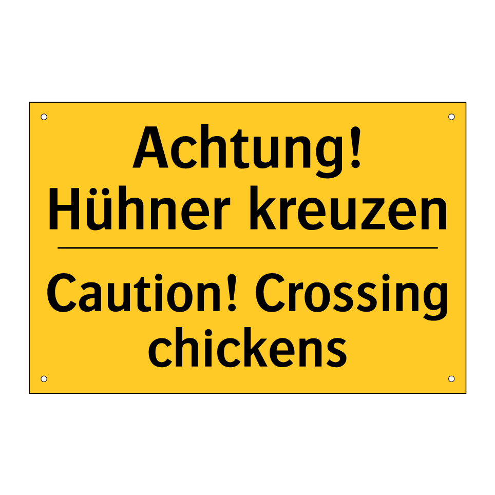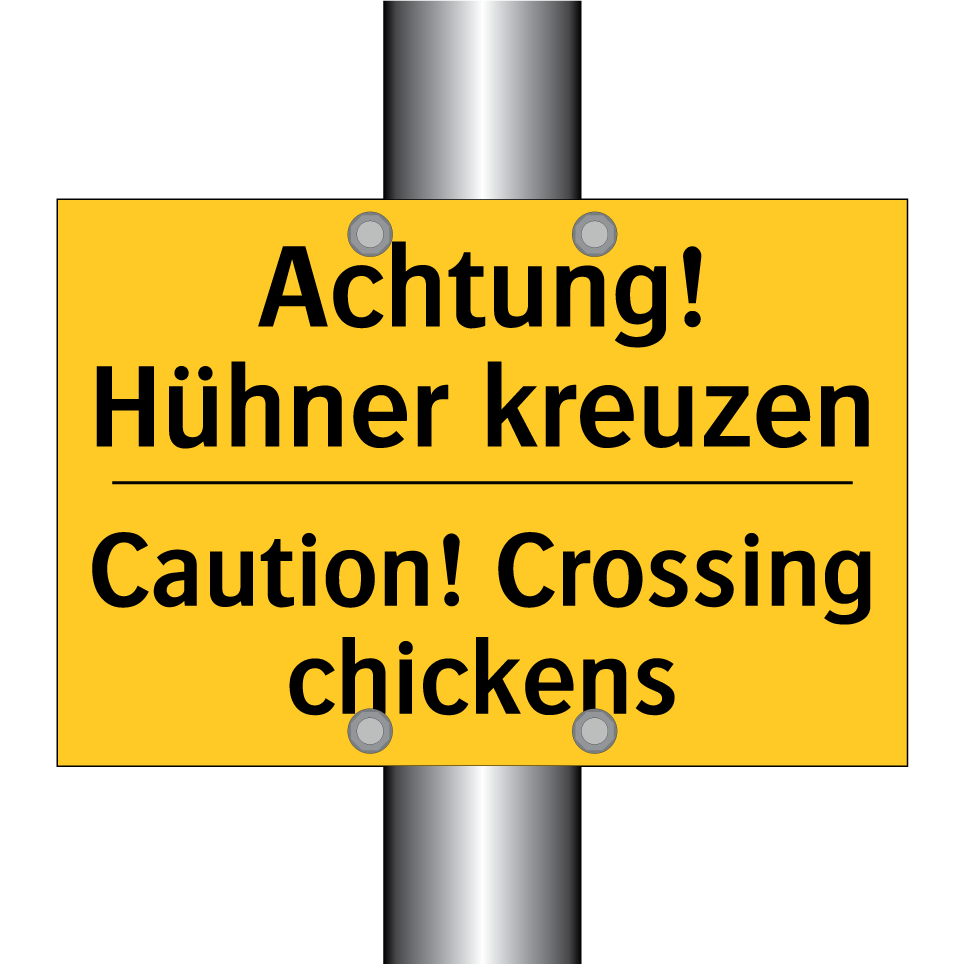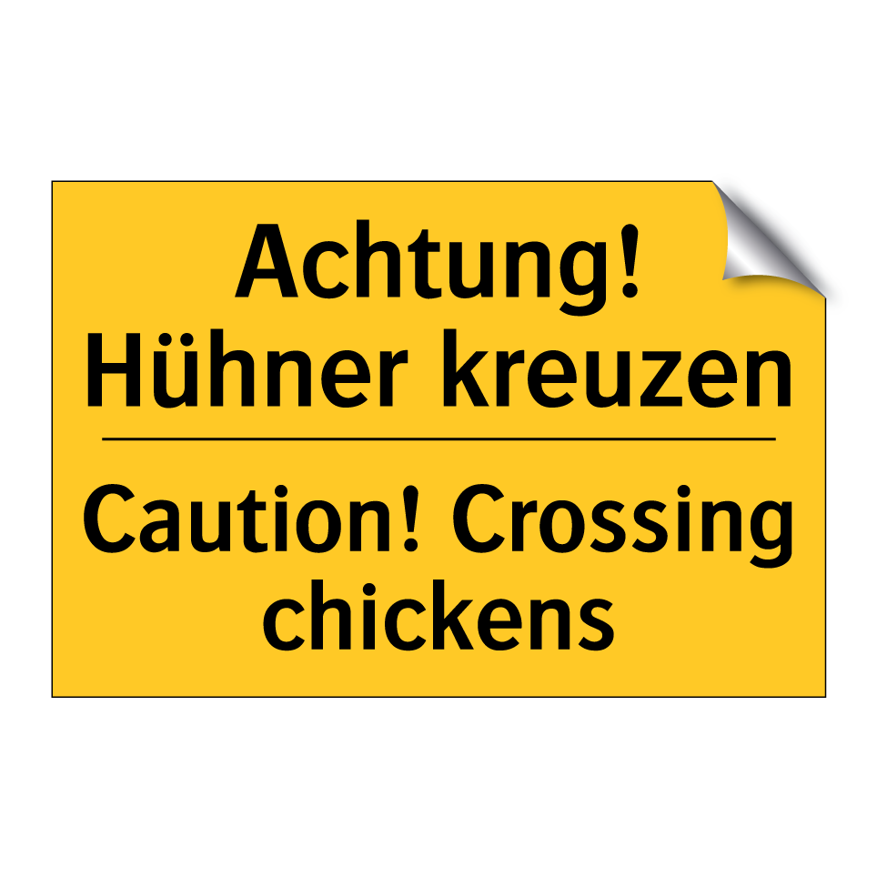 Zweisprachiges Warnschild mit deutschem Text Achtung! Hühner kreuzen und englischem Text Caution! Crossing chickens