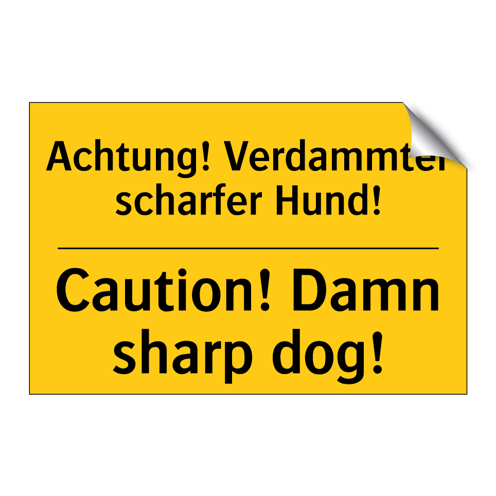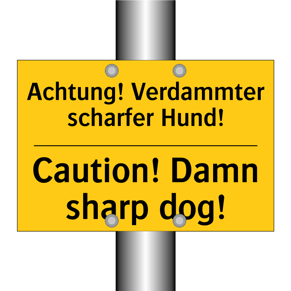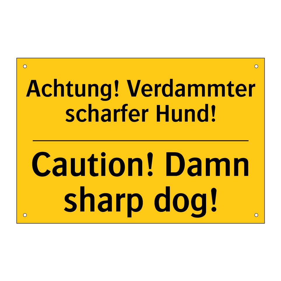 Zweisprachiges Warnschild mit deutschem Text Achtung! Verdammter scharfer Hund! und englischem Text Caution! Damn sharp dog!