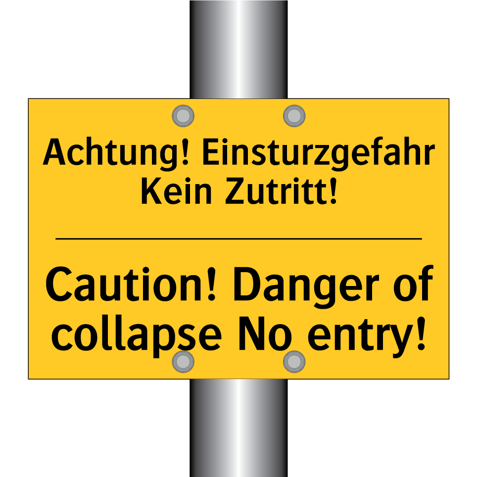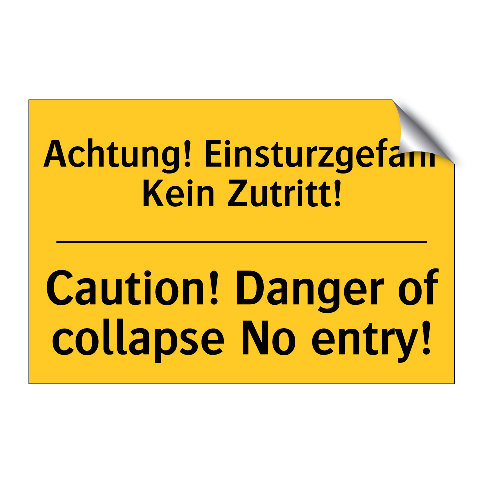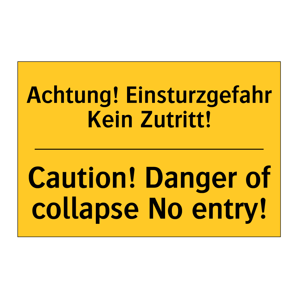 Zweisprachiges Warnschild mit deutschem Text Achtung! Einsturzgefahr Kein Zutritt! und englischem Text Caution! Danger of collapse No entry!