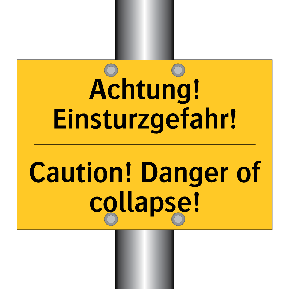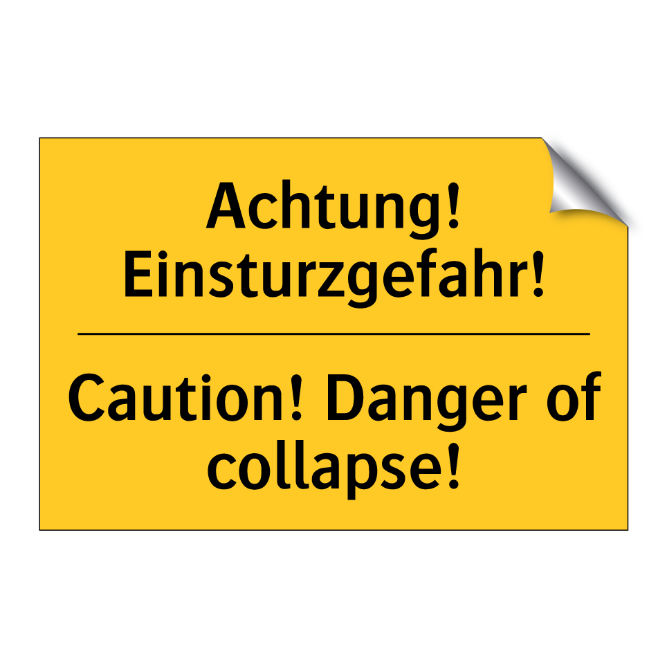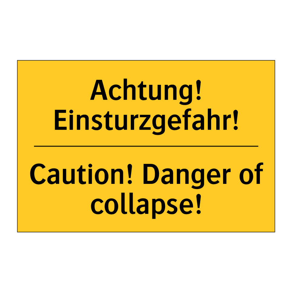Zweisprachiges Warnschild mit deutschem Text Achtung! Einsturzgefahr! und englischem Text Caution! Danger of collapse!