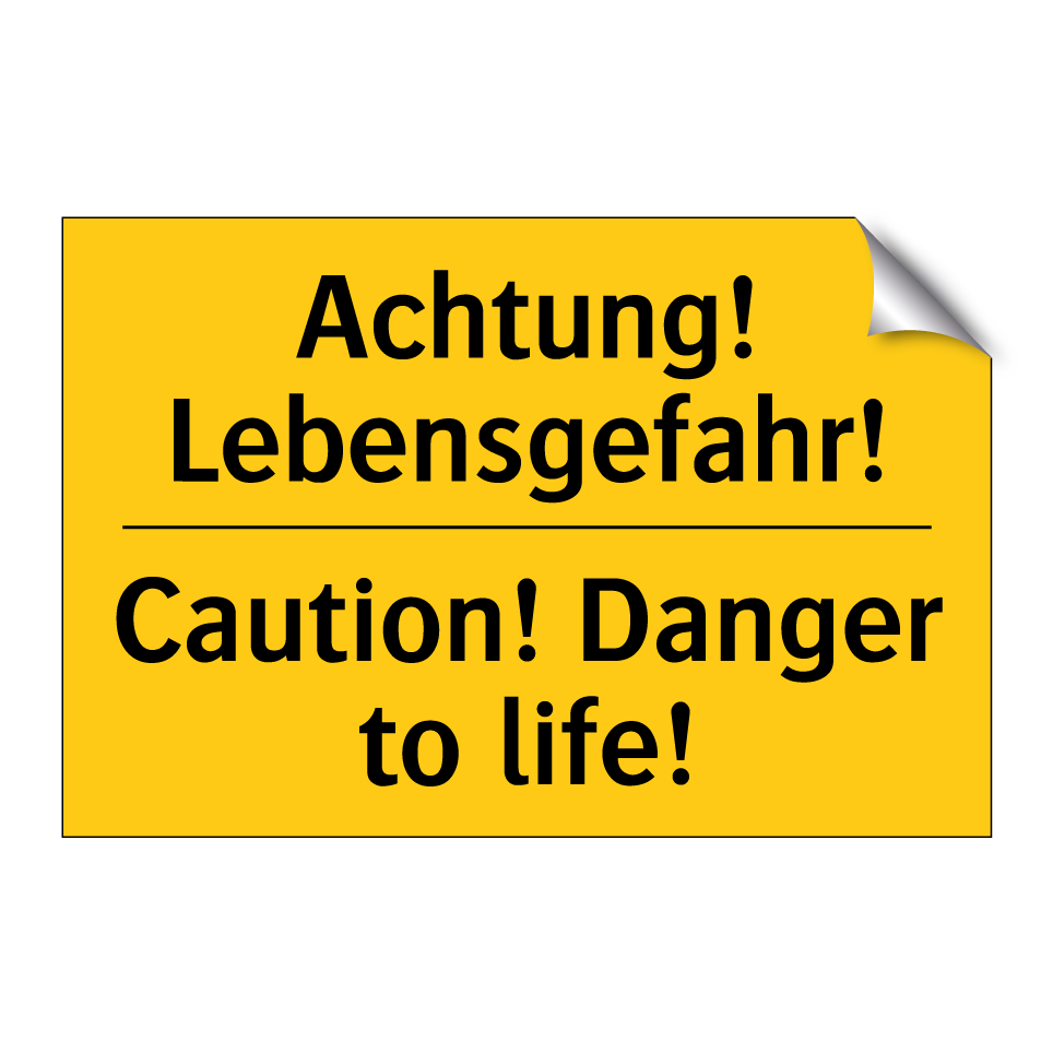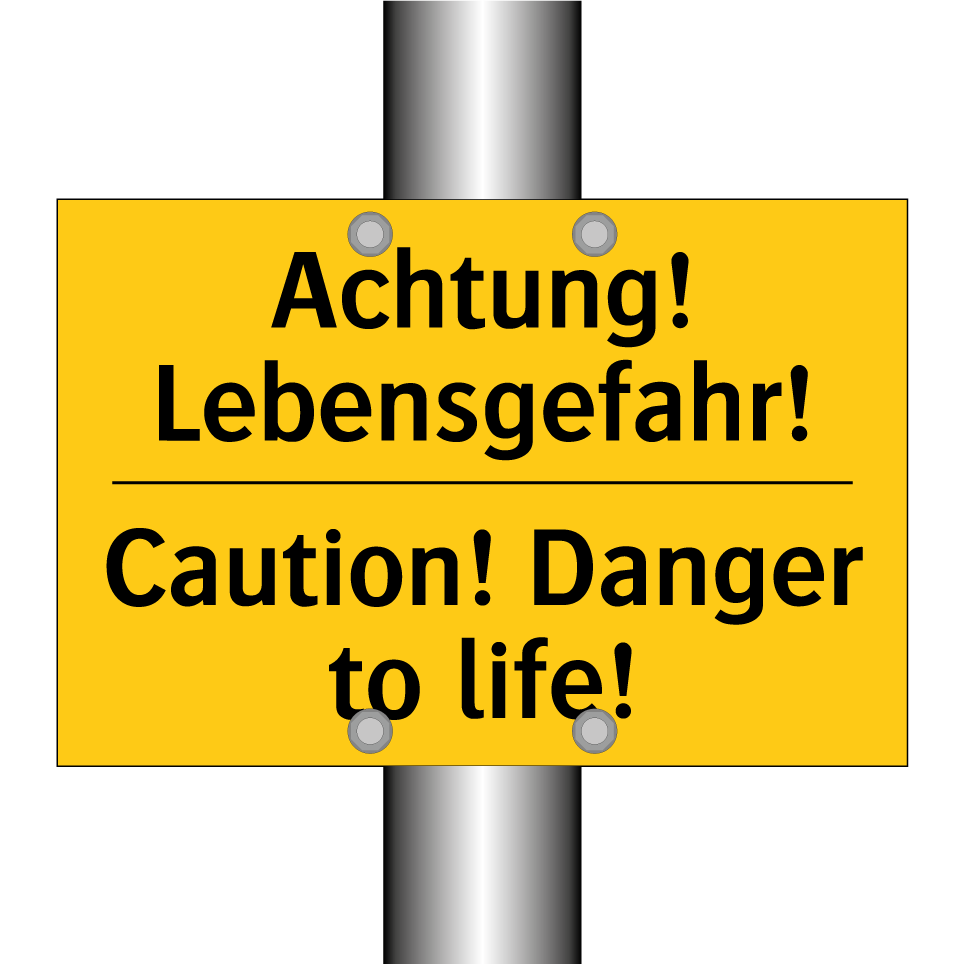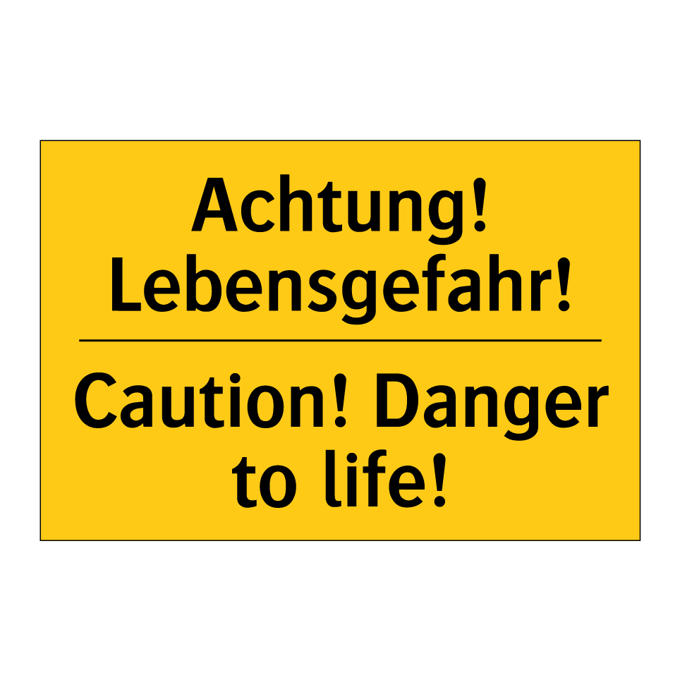Zweisprachiges Warnschild mit deutschem Text Achtung! Lebensgefahr! und englischem Text Caution! Danger to life!