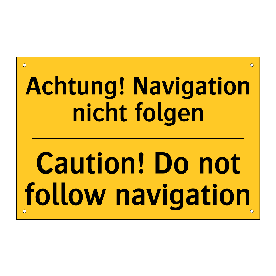 Zweisprachiges Warnschild mit deutschem Text Achtung! Navigation nicht folgen und englischem Text Caution! Do not follow navigation