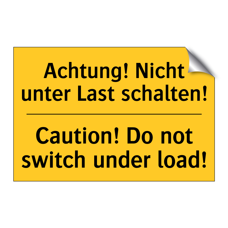 Zweisprachiges Warnschild mit deutschem Text Achtung! Nicht unter Last schalten! und englischem Text Caution! Do not switch under load!